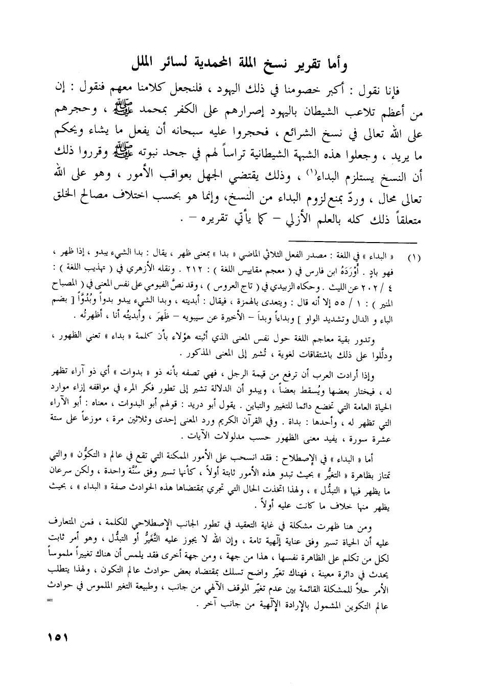 فإنا نقول: أكبر خصومنا في ذلك اليهود، فلنجعل كلامنا معهم فنقول: إن من أعظم تلاعب الشيطان باليهود إصرارهم على الكفر بمحمد صلّى اللَّه عليه وسلم، وحجرهم على اللَّه تعالى في نسخ الشرائع، فحجروا عليه سبحانه أن يفعل ما يشاء ويحكم ما يريد، وجعلوا هذه الشبهة الشيطانية تراسا لهم في جحد نبوته صلّى اللَّه عليه وسلم وقرروا ذلك أن النسخ يستلزم البداء [ (1) ] ، وذلك يقتضي الجهل بعواقب الأمور، وهو على اللَّه تعالى محال، وردّ بمنع لزوم البداء من النسخ، وإنما هو بحسب اختلاف مصالح الخلق متعلقا ذلك كله بالعلم الأزلي- كما يأتي تقريره-.