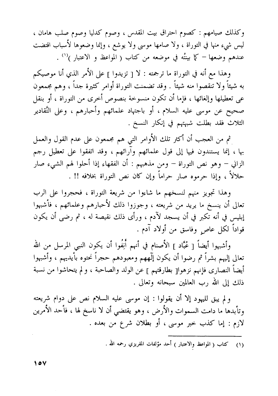 وهذا مع أنه في التوراة ما ترجمته: لا [تزيدوا] على الأمر الّذي أنا موصيكم به شيئا ولا تنقصوا منه شيئا. وقد تضمنت التوراة أوامر كثيرة جدا، وهم مجمعون على تعطيلها وإلغائها، فإما أن تكون منسوخة بنصوص أخرى من التوراة، أو بنقل صحيح عن موسى عليه السلام، أو باجتهاد علمائهم وأحبارهم، وعلى التّقادير الثلاث فقد بطلت شبهتهم في إنكار النسخ.