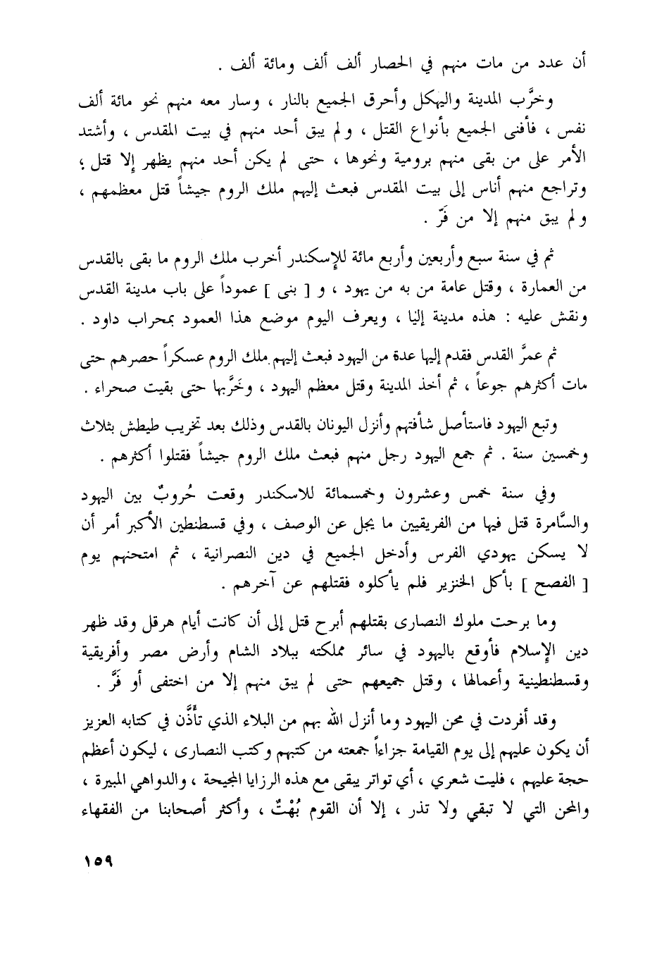 وقد أفردت في محن اليهود وما أنزل اللَّه بهم من البلاء الّذي تأذّن في كتابه العزيز أن يكون عليهم إلى يوم القيامة جزاء جمعته من كتبهم وكتب النصارى، ليكون أعظم حجة عليهم، فليت شعري، أي تواتر يبقى مع هذه الرزايا المجيحة، والدواهي المبيرة، والمحن التي لا تبقي ولا تذر، إلا أن القوم بهت، وأكثر أصحابنا من الفقهاء