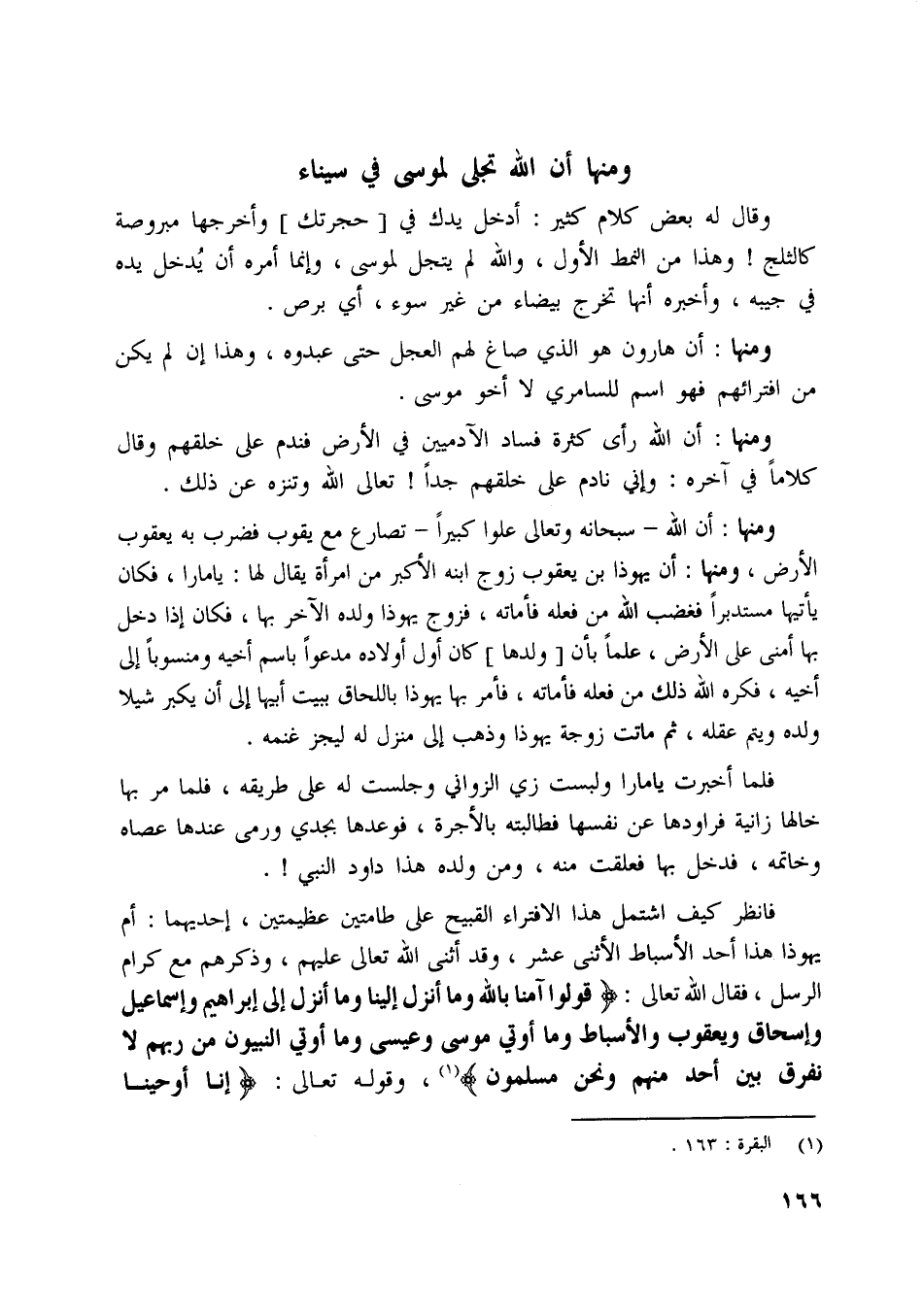 وقال له بعض كلام كثير: أدخل يدك في [حجرتك] وأخرجها مبروصة كالثلج! وهذا من النمط الأول، واللَّه لم يتجل لموسى، وإنما أمره أن يدخل يده في جيبه، وأخبره أنها تخرج بيضاء من غير سوء، أي برص.