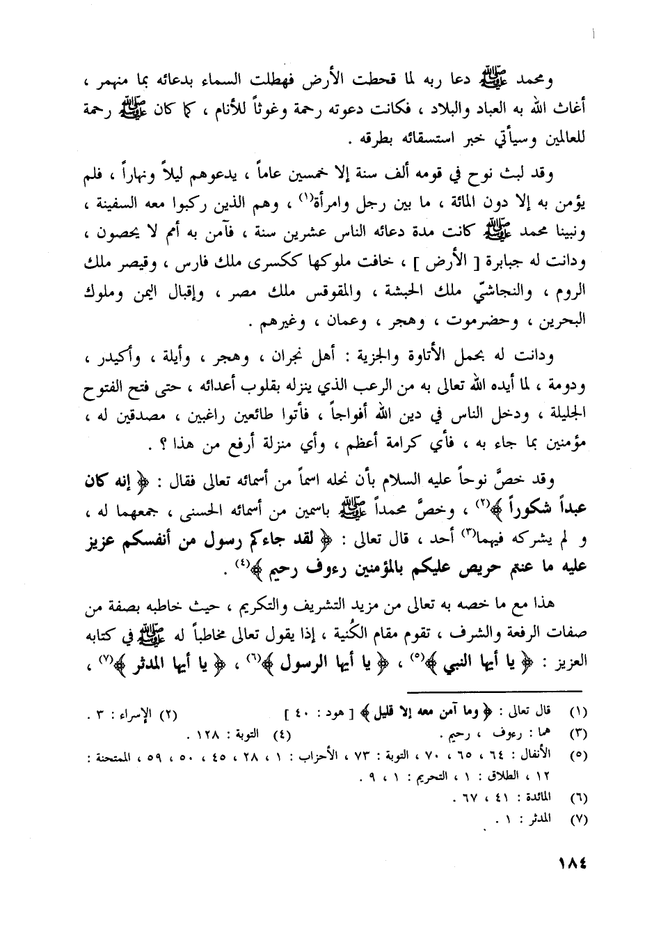 وقد خصّ نوحا عليه السلام بأن نحلة اسما من أسمائه تعالى فقال: إِنَّهُ كانَ عَبْداً شَكُوراً [ (2) ] ، وخصّ محمدا صلّى اللَّه عليه وسلم باسمين من أسمائه الحسنى، جمعهما له، ولم يشركه فيهما [ (3) ] أحد، قال تعالى: لَقَدْ جاءَكُمْ رَسُولٌ مِنْ أَنْفُسِكُمْ عَزِيزٌ عَلَيْهِ ما عَنِتُّمْ حَرِيصٌ عَلَيْكُمْ بِالْمُؤْمِنِينَ رَؤُفٌ رَحِيمٌ [ (4) ] .