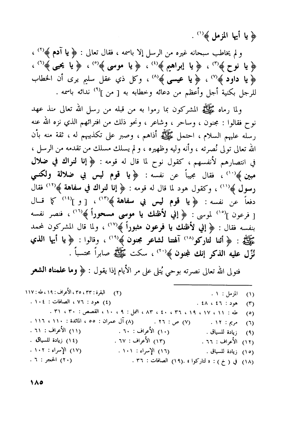 ولما رماه صلّى اللَّه عليه وسلم المشركون بما رموا به من قبله من رسل اللَّه تعالى منذ عهد نوح فقالوا: مجنون، وساحر، وشاعر، ونحو ذلك من افترائهم الّذي نزه اللَّه عنه رسله عليهم السلام، احتمل صلّى اللَّه عليه وسلم أذاهم، وصبر على تكذيبهم له، ثقة منه بأن اللَّه تعالى تولى نصرته، وأنه وليه وظهيره، ولم يسلك مسلك من تقدمه من الرسل، في انتصارهم لأنفسهم، كقول نوح لما قال له قومه: إِنَّا لَنَراكَ فِي ضَلالٍ مُبِينٍ [ (10) ] ، فقال مجيبا عن نفسه: يا قَوْمِ لَيْسَ بِي ضَلالَةٌ وَلكِنِّي رَسُولٌ [ (11) ] ، وكقول هود لما قال له قومه: إِنَّا لَنَراكَ فِي سَفاهَةٍ [ (12) ] فقال دفعا عن نفسه: يا قَوْمِ لَيْسَ بِي سَفاهَةٌ [ (13) ] ، [و] [ (14) ] كما قال [فرعون] [ (15) ] لموسى: إِنِّي لَأَظُنُّكَ يا مُوسى مَسْحُوراً [ (16) ] ، فنصر نفسه بنفسه فقال: إِنِّي لَأَظُنُّكَ يا فِرْعَوْنُ مَثْبُوراً [ (17) ] ، ولما قال المشركون لمحمد صلّى اللَّه عليه وسلم: أَإِنَّا لَتارِكُوا [ (18) ] آلِهَتِنا لِشاعِرٍ مَجْنُونٍ [ (19) ] ، وقالوا: يا أَيُّهَا الَّذِي نُزِّلَ عَلَيْهِ الذِّكْرُ إِنَّكَ لَمَجْنُونٌ [ (20) ] ، سكت صلّى اللَّه عليه وسلم صابرا محتسبا.