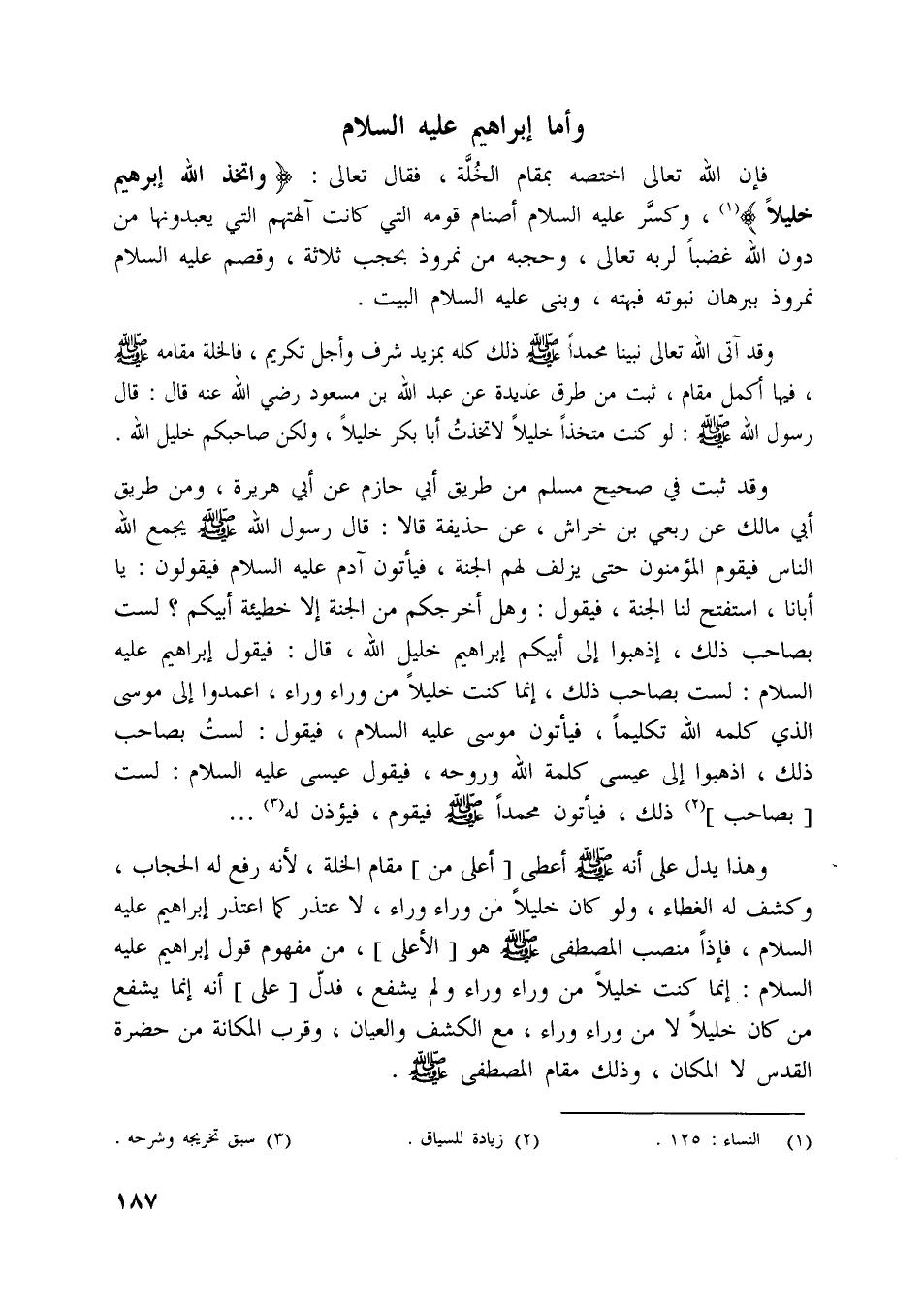 وهذا يدل على أنه صلّى اللَّه عليه وسلم أعطى [أعلى من] مقام الخلة، لأنه رفع له الحجاب، وكشف له الغطاء، ولو كان خليلا من وراء وراء، لاعتذر كما اعتذر إبراهيم عليه السلام، فإذا منصب المصطفى صلّى اللَّه عليه وسلم هو [الأعلى] ، من مفهوم قول إبراهيم عليه السلام: إنما كنت خليلا من وراء وراء ولم يشفع، فدلّ [على] أنه إنما يشفع من كان خليلا لا من وراء وراء، مع الكشف والعيان، وقرب المكانة من حضرة القدس لا المكان، وذلك مقام المصطفى صلّى اللَّه عليه وسلم.