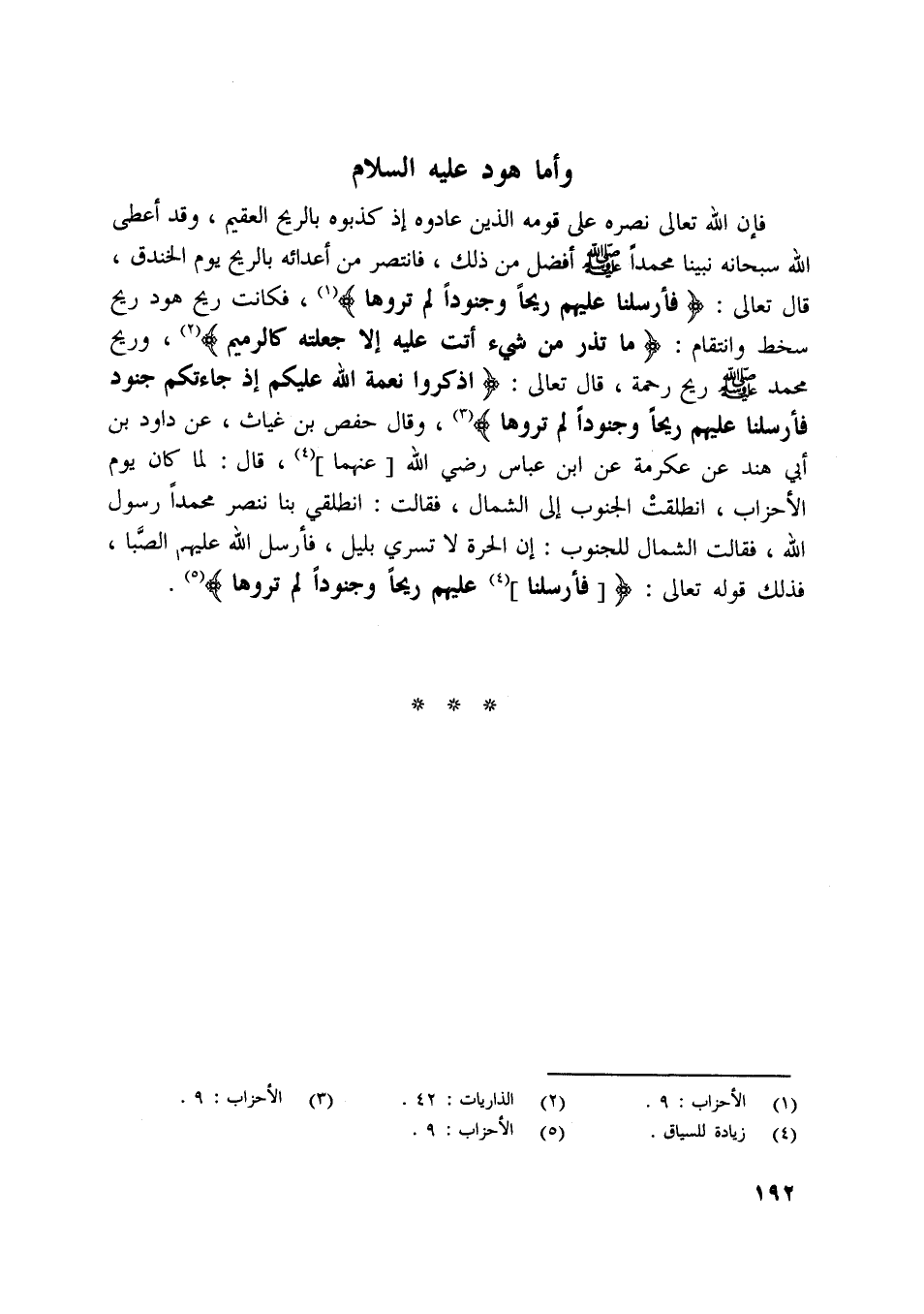 فإن اللَّه تعالى نصره على قومه الذين عادوه إذ كذبوه بالريح العقيم، وقد أعطى اللَّه سبحانه نبينا محمدا صلّى اللَّه عليه وسلم أفضل من ذلك، فانتصر من أعدائه بالريح يوم الخندق، قال تعالى: فَأَرْسَلْنا عَلَيْهِمْ رِيحاً وَجُنُوداً لَمْ تَرَوْها [ (1) ] ، فكانت ريح هود ريح سخط وانتقام: ما تَذَرُ مِنْ شَيْءٍ أَتَتْ عَلَيْهِ إِلَّا جَعَلَتْهُ كَالرَّمِيمِ [ (2) ] ، وريح محمد صلّى اللَّه عليه وسلم ريح رحمة، قال تعالى: اذْكُرُوا نِعْمَةَ اللَّهِ عَلَيْكُمْ إِذْ جاءَتْكُمْ جُنُودٌ فَأَرْسَلْنا عَلَيْهِمْ رِيحاً وَجُنُوداً لَمْ تَرَوْها [ (3) ] ، وقال حفص بن غياث، عن داود بن أبي هند عن عكرمة عن ابن عباس رضي اللَّه [عنهما] [ (4) ] ، قال: لما كان يوم الأحزاب، انطلقت الجنوب إلى الشمال، فقالت: انطلقي بنا ننصر محمدا رسول اللَّه، فقالت الشمال للجنوب: إن الحرة لا تسري بليل، فأرسل اللَّه عليهم الصّبا، فذلك قوله تعالى: [فَأَرْسَلْنا] [ (4) ] عَلَيْهِمْ رِيحاً وَجُنُوداً لَمْ تَرَوْها [ (5) ] .