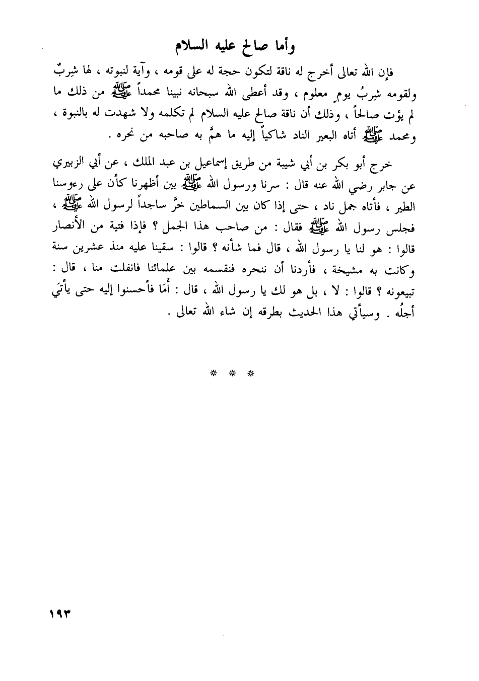 فإن اللَّه تعالى أخرج له ناقة لتكون حجة له على قومه، وآية لنبوته، لها شرب ولقومه شرب يوم معلوم، وقد أعطى اللَّه سبحانه نبينا محمدا صلّى اللَّه عليه وسلم من ذلك ما لم يؤت صالحا، وذلك أن ناقة صالح عليه السلام لم تكلمه ولا شهدت له بالنّبوّة، ومحمد صلّى اللَّه عليه وسلم أتاه البعير الناد شاكيا إليه ما همّ به صاحبه من نحره.