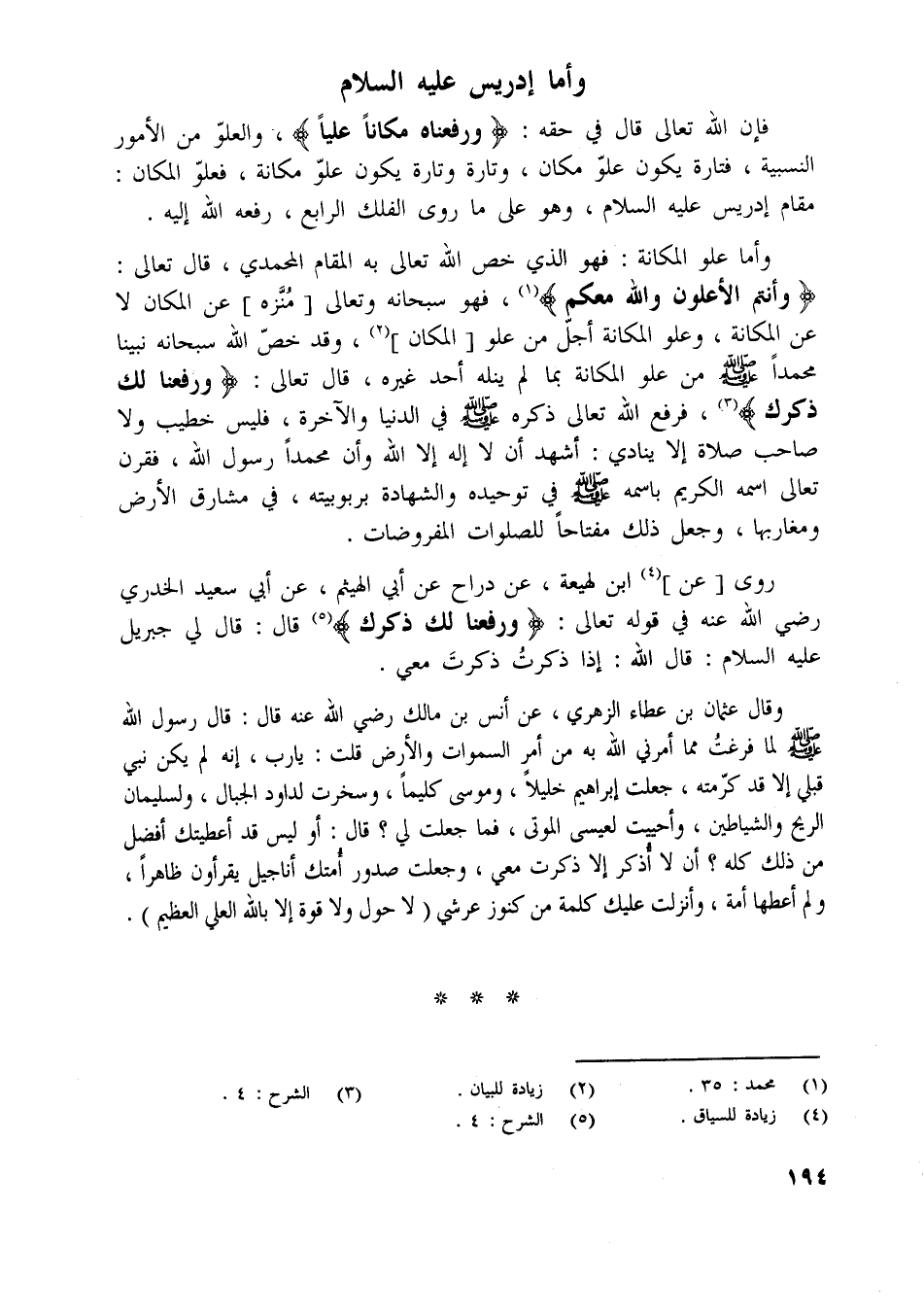 وَأَنْتُمُ الْأَعْلَوْنَ وَاللَّهُ مَعَكُمْ [ (1) ] ، فهو سبحانه وتعالى [منّزه] عن المكان لا عن المكانة، وعلو المكانة أجلّ من علو [المكان] [ (2) ] ، وقد خصّ اللَّه سبحانه نبينا محمدا صلّى اللَّه عليه وسلم من علو المكانة بما لم ينله أحد غيره، قال تعالى: وَرَفَعْنا لَكَ ذِكْرَكَ [ (3) ] ، فرفع اللَّه تعالى ذكره صلّى اللَّه عليه وسلم في الدنيا والآخرة، فليس خطيب ولا صاحب صلاة إلا ينادي: أشهد أن لا إله إلا اللَّه وأن محمدا رسول اللَّه، فقرن تعالى اسمه الكريم باسمه صلّى اللَّه عليه وسلم في توحيده والشهادة بربوبيته، في مشارق الأرض ومغاربها، وجعل ذلك مفتاحا للصلوات المفروضات.
