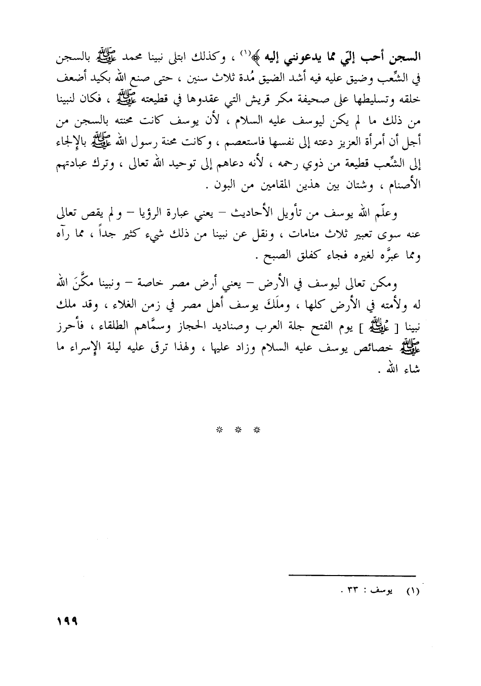 السِّجْنُ أَحَبُّ إِلَيَّ مِمَّا يَدْعُونَنِي إِلَيْهِ [ (1) ] ، وكذلك ابتلى نبينا محمد صلّى اللَّه عليه وسلم بالسجن في الشّعب وضيق عليه فيه أشد الضيق مدة ثلاث سنين، حتى صنع اللَّه بكيد أضعف خلقه وتسليطها على صحيفة مكر قريش التي عقدوها في قطيعته صلّى اللَّه عليه وسلم، فكان لنبينا من ذلك ما لم يكن ليوسف عليه السلام، لأن يوسف كانت محنته بالسجن من أجل أن امرأة العزيز دعته إلى نفسها فاستعصم، وكانت محنة رسول اللَّه صلّى اللَّه عليه وسلم بالإلجاء إلى الشّعب قطيعة من ذوي رحمه، لأنه دعاهم إلى توحيد اللَّه تعالى، وترك عبادتهم الأصنام، وشتان بين هذين المقامين من البون.