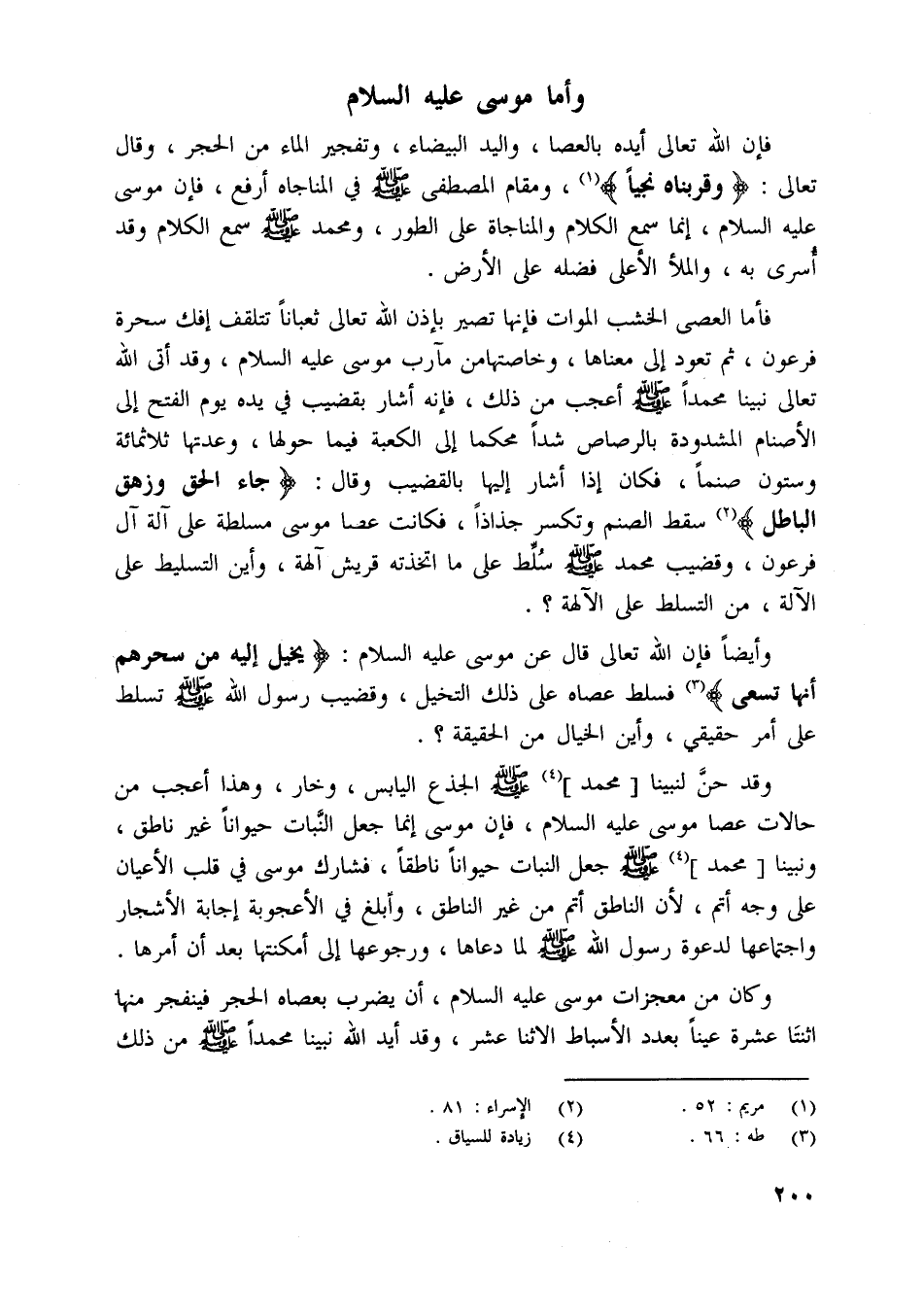 فإن اللَّه تعالى أيده بالعصا، واليد البيضاء، وتفجير الماء من الحجر، وقال تعالى: وَقَرَّبْناهُ نَجِيًّا [ (1) ] ، ومقام المصطفى صلّى اللَّه عليه وسلم في المناجاة أرفع، فإن موسى عليه السلام، إنما سمع الكلام والمناجاة على الطور، ومحمد صلّى اللَّه عليه وسلم سمع الكلام وقد أسرى به، والملأ الأعلى فضله على الأرض.