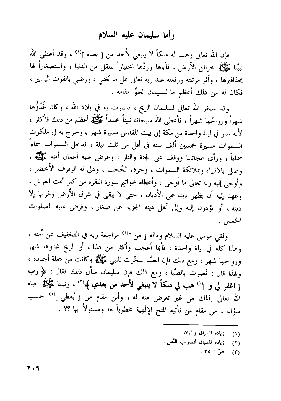 ولقي موسى عليه السلام وما له [من] [ (1) ] مراجعة ربه في التخفيف عن أمته، وهذا كله في ليلة واحدة، فأيما أعجب وأكثر من هذا، أو الريح غدوها شهر ورواحها شهر، ومع ذلك فإن الصّبا سخّرت للنّبيّ صلّى اللَّه عليه وسلم وكانت من جملة أجناده، ولهذا قال: نصرت بالصّبا، ومع ذلك فإن سليمان سأل ذلك فقال: رَبِّ [اغْفِرْ لِي وَ] [ (2) ] هَبْ لِي مُلْكاً لا يَنْبَغِي لِأَحَدٍ مِنْ بَعْدِي [ (3) ] ، ونبينا صلّى اللَّه عليه وسلم حباه اللَّه تعالى بذلك من غير تعرض منه له، وأين مقام من [يعطي] [ (1) ] حسب سؤاله، من مقام من تأتيه المنح الإلهية مخطوبا لها ومسئولا بها؟
