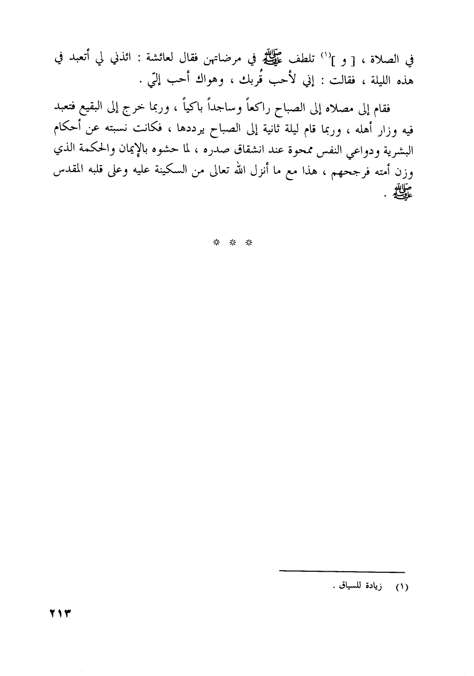 فقام إلى مصلاه إلى الصباح راكعا وساجدا باكيا، وربما خرج إلى البقيع فتعبد فيه وزار أهله، وربما قام ليلة ثانية إلى الصباح يرددها، فكانت نسبته عن أحكام البشرية ودواعي النفس ممحوة عند انشقاق صدره، لما حشوه بالإيمان والحكمة الّذي وزن أمته فرجحهم، هذا مع ما أنزل اللَّه تعالى من السكينة عليه وعلى قلبه المقدس صلّى اللَّه عليه وسلم.