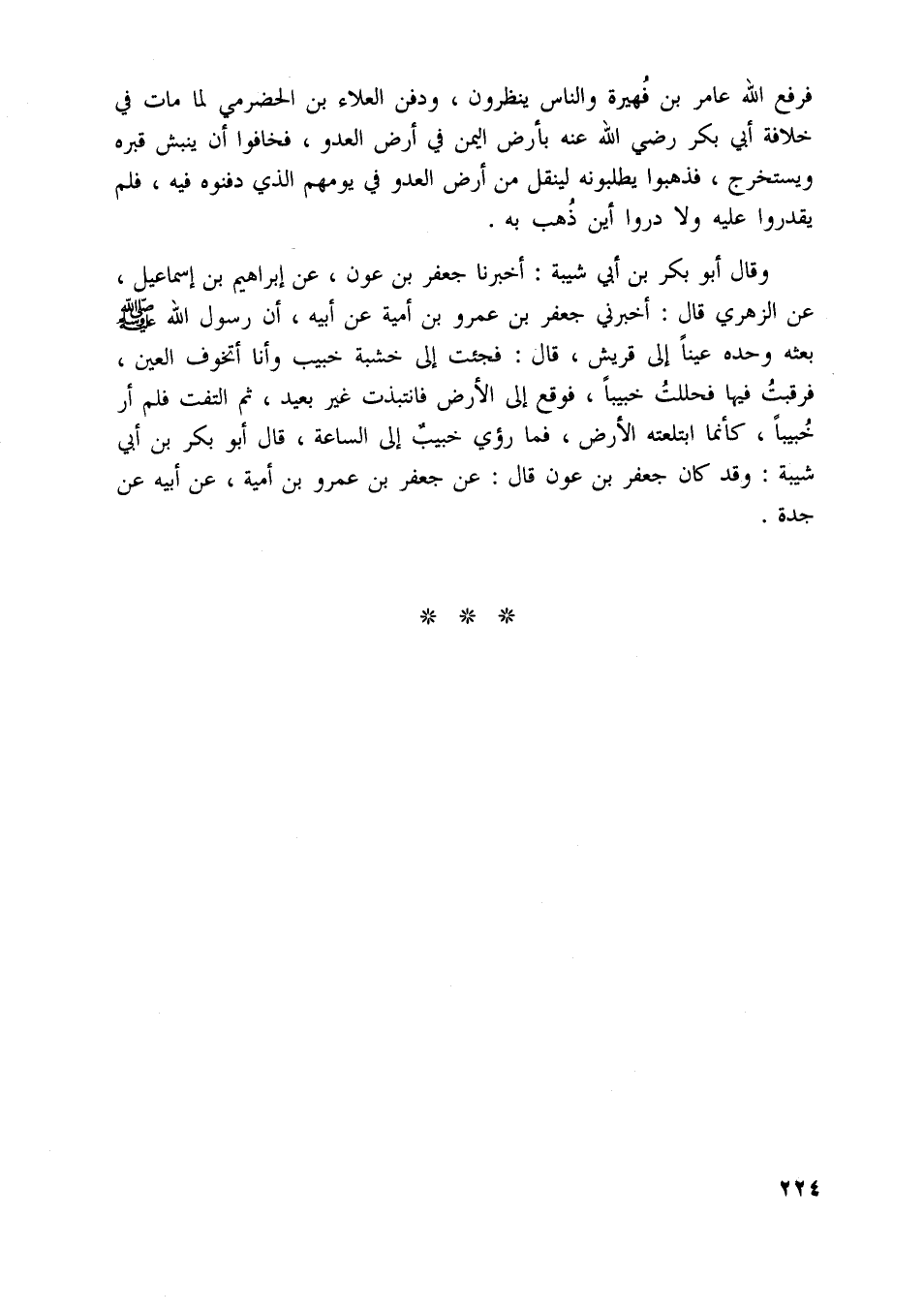 فرفع اللَّه عامر بن فهيرة والناس ينظرون، ودفن العلاء بن الحضرميّ لما مات في خلافة أبي بكر رضي اللَّه عنه بأرض اليمن في أرض العدو، فخافوا أن ينبش قبره ويستخرج، فذهبوا يطلبونه لينقل من أرض العدو في يومهم الّذي دفنوه فيه، فلم يقدروا عليه ولا دروا أين ذهب به.