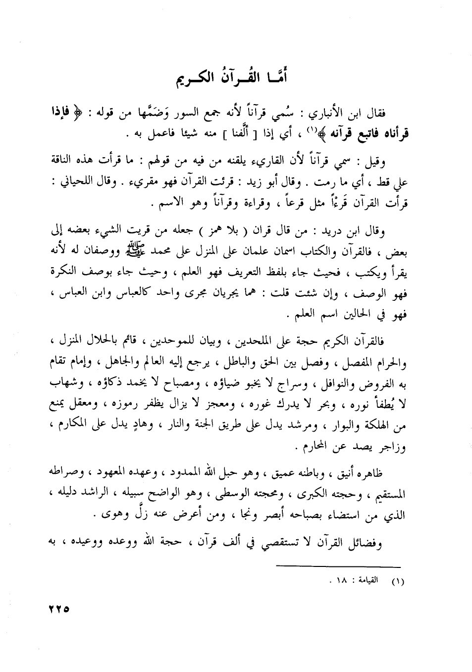 فقال ابن الأنباري: سمي قرآنا لأنه جمع السور وضمّها من قوله: فَإِذا قَرَأْناهُ فَاتَّبِعْ قُرْآنَهُ