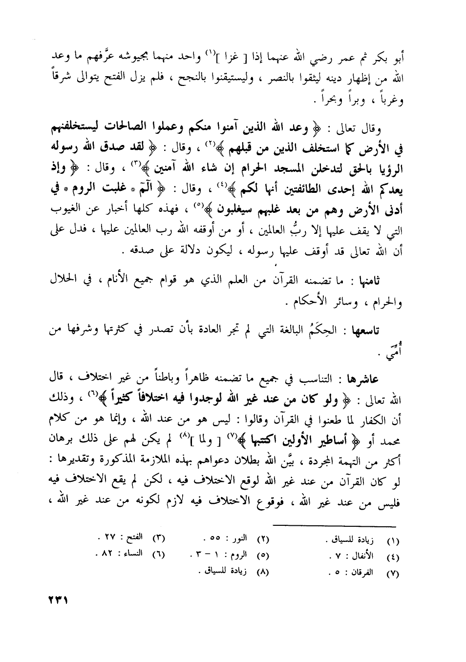 عاشرها: التناسب في جميع ما تضمنه ظاهرا وباطنا من غير اختلاف، قال اللَّه تعالى: وَلَوْ كانَ مِنْ عِنْدِ غَيْرِ اللَّهِ لَوَجَدُوا فِيهِ اخْتِلافاً كَثِيراً [ (6) ] ، وذلك أن الكفار لما طعنوا في القرآن وقالوا: ليس هو من عند اللَّه، وإنما هو من كلام محمد أو أَساطِيرُ الْأَوَّلِينَ اكْتَتَبَها [ (7) ] [ولما] [ (8) ] لم يكن لهم على ذلك برهان أكثر من التهمة المجردة، بيّن اللَّه بطلان دعواهم بهذه الملازمة المذكورة وتقديرها: