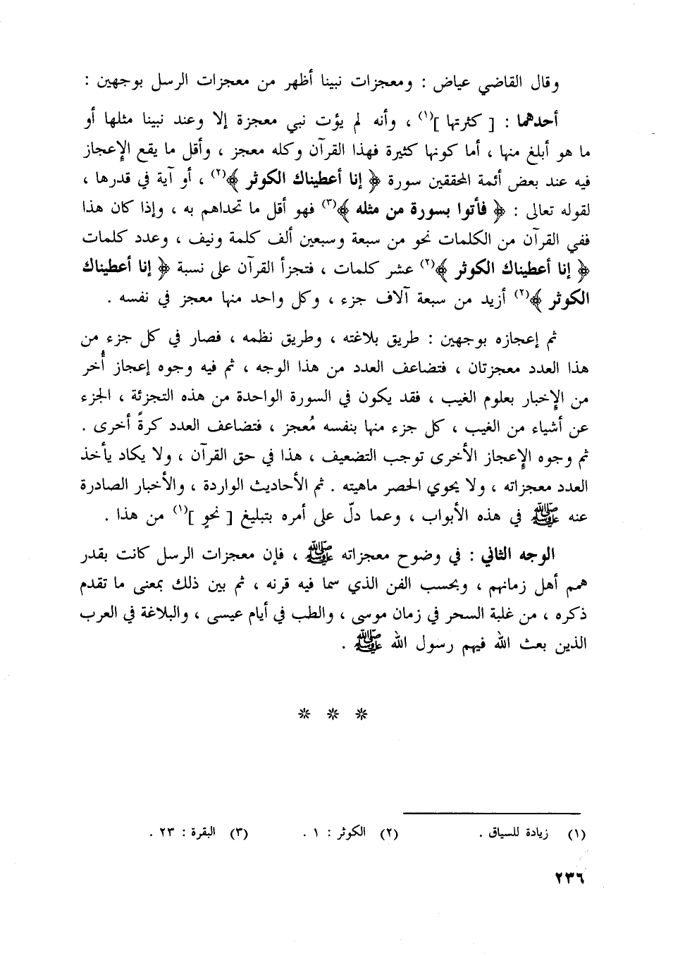 أحدهما: [كثرتها] [ (1) ] ، وأنه لم يؤت نبي معجزة إلا وعند نبينا مثلها أو ما هو أبلغ منها، أما كونها كثيرة فهذا القرآن وكله معجز، وأقل ما يقع الإعجاز فيه عند بعض أئمة المحققين سورة إِنَّا أَعْطَيْناكَ الْكَوْثَرَ [ (2) ] ، أو آية في قدرها، لقوله تعالى: فَأْتُوا بِسُورَةٍ مِنْ مِثْلِهِ [ (3) ] فهو أقل ما تحداهم به، وإذا كان هذا ففي القرآن من الكلمات نحو من سبعة وسبعين ألف كلمة ونيف، وعدد كلمات إِنَّا أَعْطَيْناكَ الْكَوْثَرَ [ (2) ] عشر كلمات، فتجزأ القرآن على نسبة إِنَّا أَعْطَيْناكَ الْكَوْثَرَ [ (2) ] أزيد من سبعة آلاف جزء، وكل واحد منها معجز في نفسه.