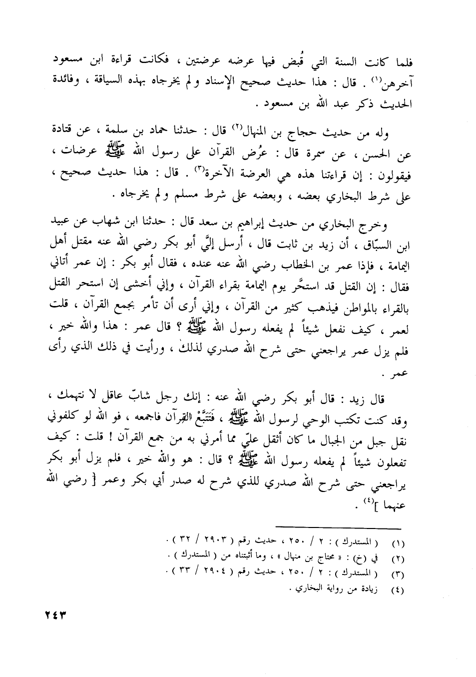 وله من حديث حجاج بن المنهال [ (2) ] قال: حدثنا حماد بن سلمة، عن قتادة عن الحسن، عن سمرة قال: عرض القرآن على رسول اللَّه صلّى اللَّه عليه وسلم عرضات، فيقولون: إن قراءتنا هذه هي العرضة الآخرة [ (3) ] . قال: هذا حديث صحيح، على شرط البخاري بعضه، وبعضه على شرط مسلم ولم يخرجاه.