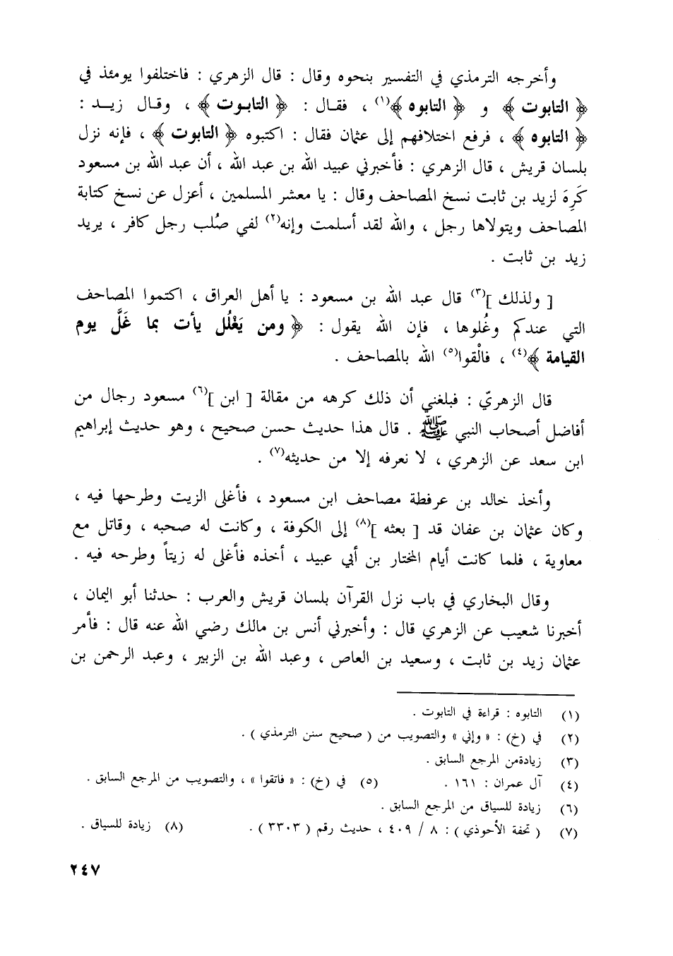 [ولذلك] [ (3) ] قال عبد اللَّه بن مسعود: يا أهل العراق، اكتموا المصاحف التي عندكم وغلوها، فإن اللَّه يقول: وَمَنْ يَغْلُلْ يَأْتِ بِما غَلَّ يَوْمَ الْقِيامَةِ [ (4) ] ، فالقوا [ (5) ] اللَّه بالمصاحف.