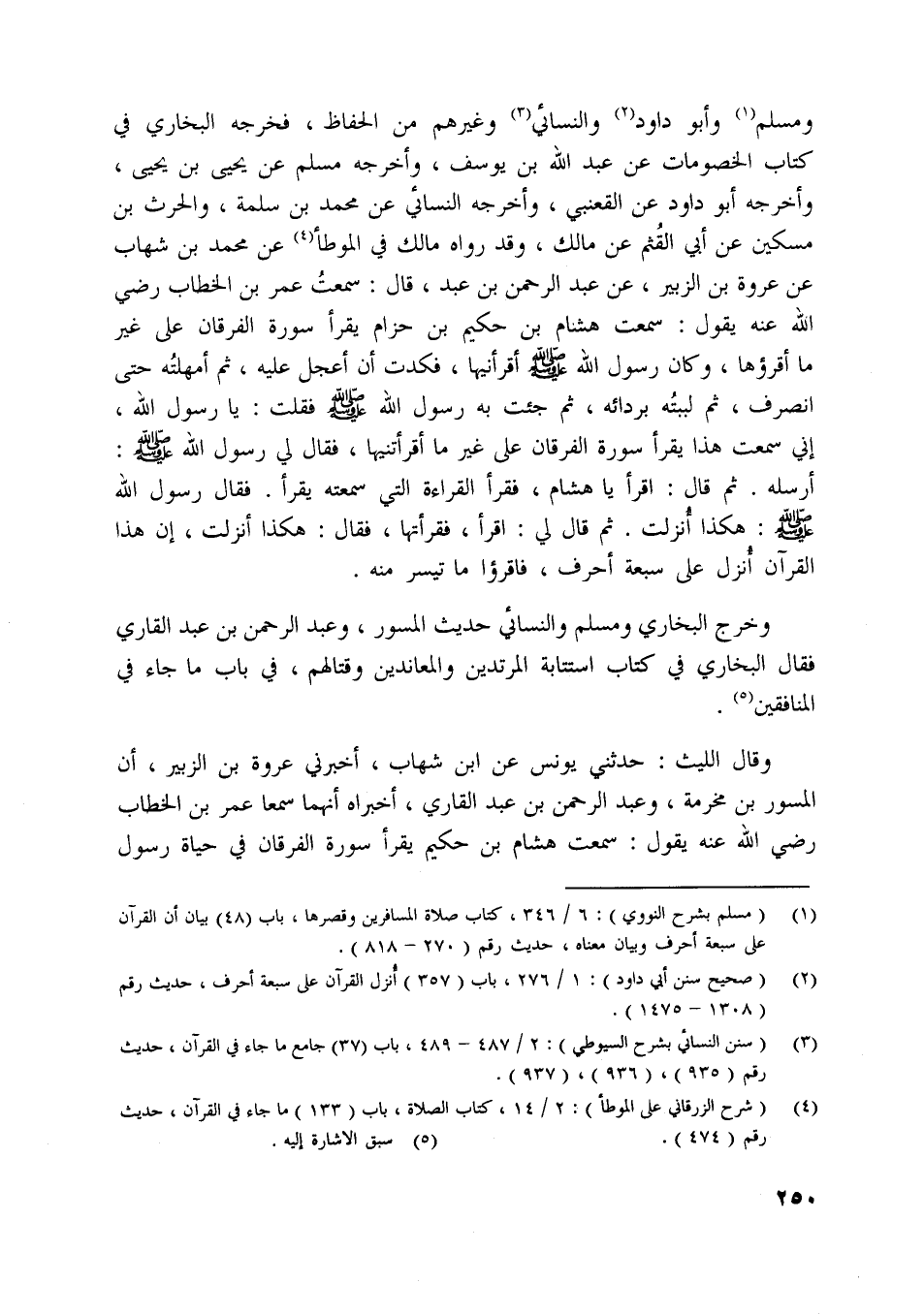 ومسلم [ (1) ] وأبو داود [ (2) ] والنسائي [ (3) ] وغيرهم من الحفاظ، فخرجه البخاري في كتاب الخصومات عن عبد اللَّه بن يوسف، وأخرجه مسلم عن يحيى بن يحيى، وأخرجه أبو داود عن القعنبي، وأخرجه النسائي عن محمد بن سلمة، والحرث بن مسكين عن أبي القثم عن مالك، وقد رواه مالك في الموطأ [ (4) ] عن محمد بن شهاب عن عروة بن الزبير، عن عبد الرحمن بن عبد، قال: سمعت عمر بن الخطاب رضي اللَّه عنه يقول: سمعت هشام بن حكيم بن حزام يقرأ سورة الفرقان على غير ما أقرؤها، وكان رسول اللَّه صلّى اللَّه عليه وسلم أقرأنيها، فكدت أن أعجل عليه، ثم أمهلته حتى انصرف، ثم لببته بردائه، ثم جئت به رسول اللَّه صلّى اللَّه عليه وسلم فقلت: يا رسول اللَّه، إني سمعت هذا يقرأ سورة الفرقان على غير ما أقرأتنيها، فقال لي رسول اللَّه صلّى اللَّه عليه وسلم: