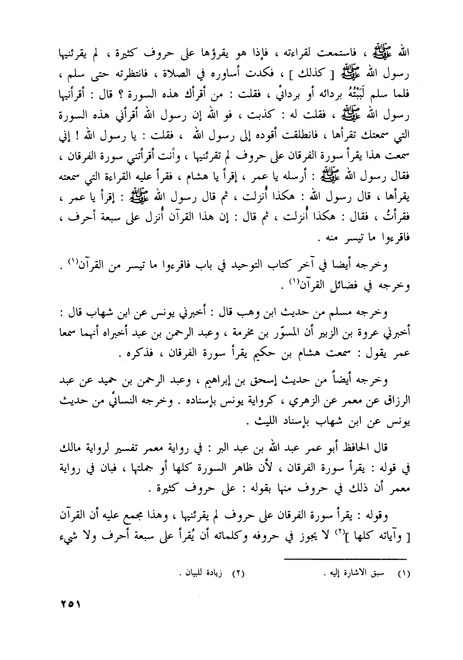 قال الحافظ أبو عمر عبد اللَّه بن عبد البر: في رواية معمر تفسير لرواية مالك في قوله: يقرأ سورة الفرقان، لأن ظاهر السورة كلها أو جملتها، فبان في رواية معمر أن ذلك في حروف منها بقوله: على حروف كثيرة.