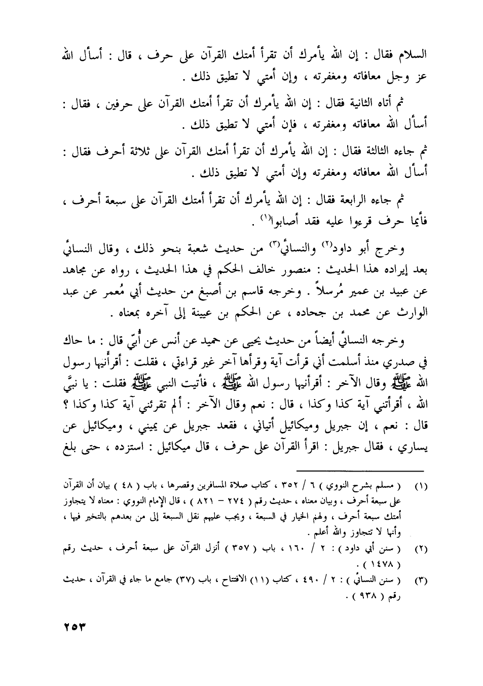[ (1) ] (مسلم بشرح النووي) 6/ 352، كتاب صلاة المسافرين وقصرها، باب (48) بيان أن القرآن على سبعة أحرف، وبيان معناه، حديث رقم (274- 821) ، قال الإمام النووي: معناه لا يتجاوز أمتك سبعة أحرف، ولهم الخيار في السبعة، ويجب عليهم نقل السبعة إلى من بعدهم بالتخير فيها، وأنها لا تتجاوز واللَّه أعلم.