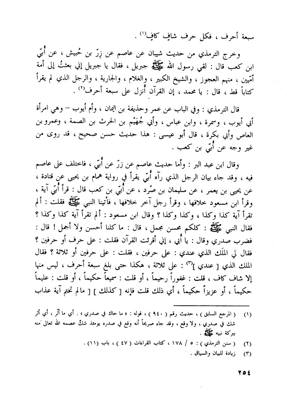 وخرج الترمذي من حديث شيبان عن عاصم عن زرّ بن حبيش، عن أبيّ ابن كعب قال: لقي رسول اللَّه صلّى اللَّه عليه وسلم جبريل، فقال يا جبريل إني بعثت إلى أمة أمّيين، منهم العجوز، والشيخ الكبير، والغلام، والجارية، والرجل الّذي لم يقرأ كتابا قط، قال: يا محمد، إن القرآن أنزل على سبعة أحرف [ (2) ] .