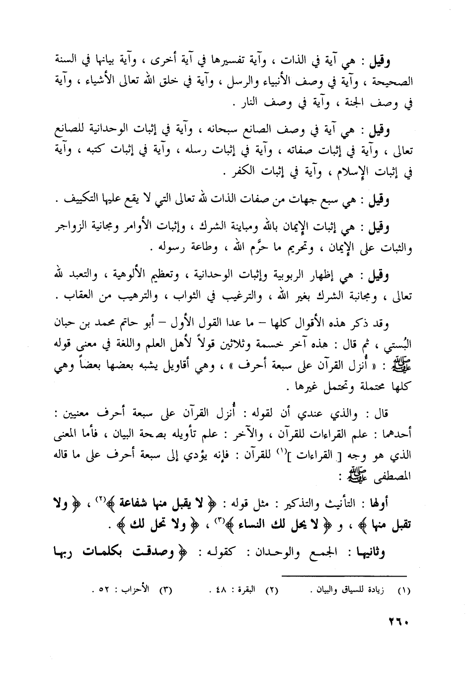 وقيل: هي آية في الذات، وآية تفسيرها في آية أخرى، وآية بيانها في السنة الصحيحة، وآية في وصف الأنبياء والرسل، وآية في خلق اللَّه تعالى الأشياء، وآية في وصف الجنة، وآية في وصف النار.
