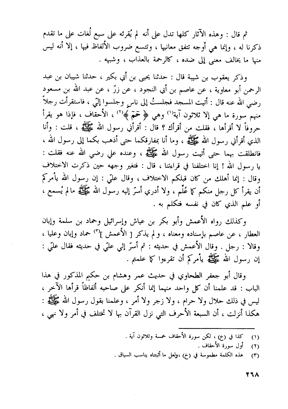 وذكر يعقوب بن شيبة قال: حدثنا يحيى بن أبي بكير، حدثنا شيبان بن عبد الرحمن أبو معاوية، عن عاصم بن أبي النجود، عن زرّ، عن عبد اللَّه بن مسعود رضي اللَّه عنه قال: أتيت المسجد فجلست إلى ناس وجلسوا إليّ، فاستقرأت رجلا منهم سورة ما هي إلا ثلاثون آية [ (1) ] وهي حم [ (2) ] ، الأحقاف، فإذا هو يقرأ حروفا لا أقرأها، فقلت من أقرأك؟ قال: أقرأني رسول اللَّه صلّى اللَّه عليه وسلم، قلت: وأنا الّذي أقرأني رسول اللَّه صلّى اللَّه عليه وسلم، وما أنا بمفارقكما حتى أذهب بكما إلى رسول اللَّه، فانطلقت بهما حتى أتيت رسول اللَّه صلّى اللَّه عليه وسلم، وعنده علي رضي اللَّه عنه فقلت: