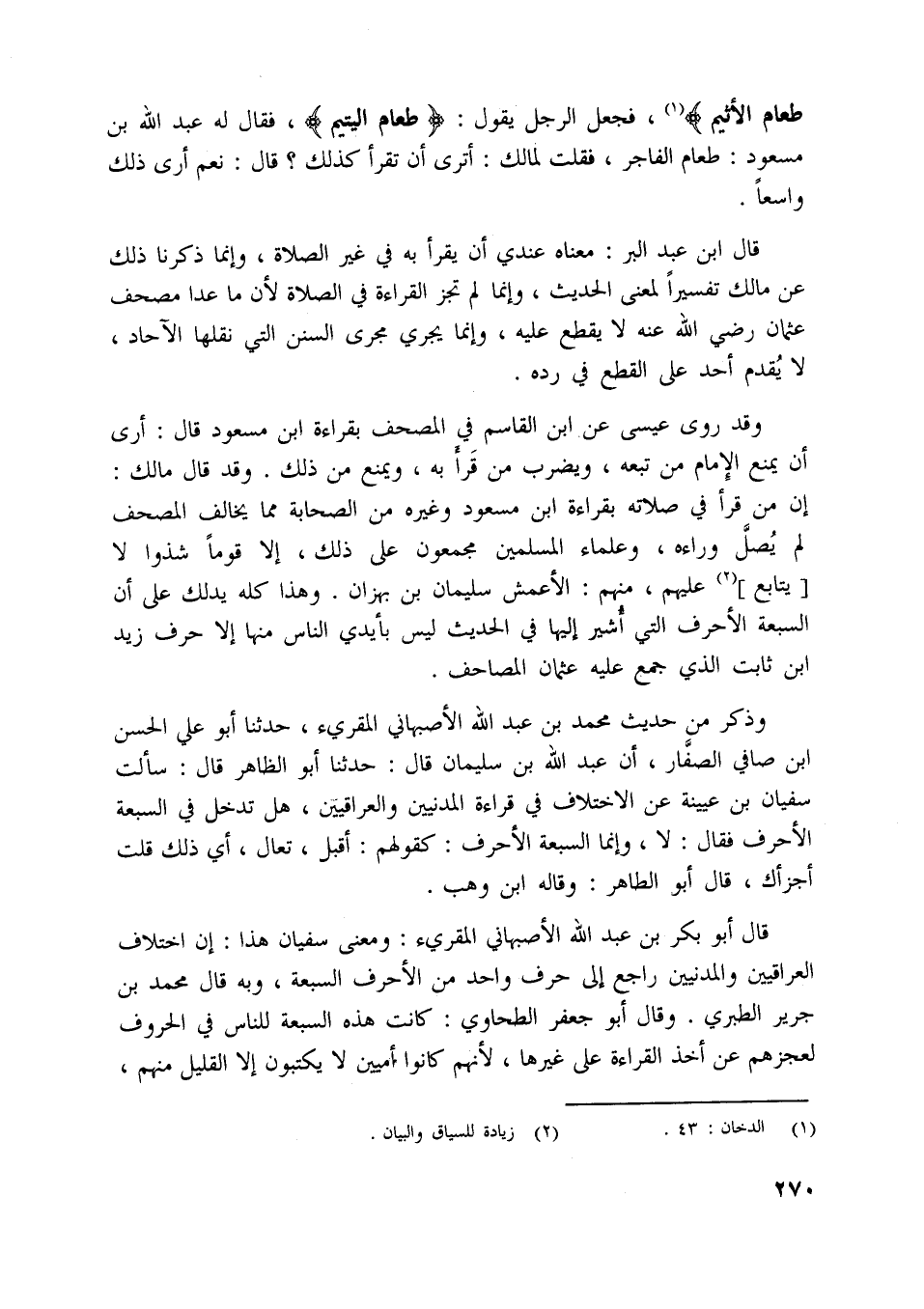 إن من قرأ في صلاته بقراءة ابن مسعود وغيره من الصحابة مما يخالف المصحف لم يصلّ وراءه، وعلماء المسلمين مجمعون على ذلك، إلا قوما شذوا لا [يتابع] [ (2) ] عليهم، منهم: الأعمش سليمان بن بهزان. وهذا كله يدلك على أن السبعة الأحرف التي أشير إليها في الحديث ليس بأيدي الناس منها إلا حرف زيد ابن ثابت الّذي جمع عليه عثمان المصاحف.