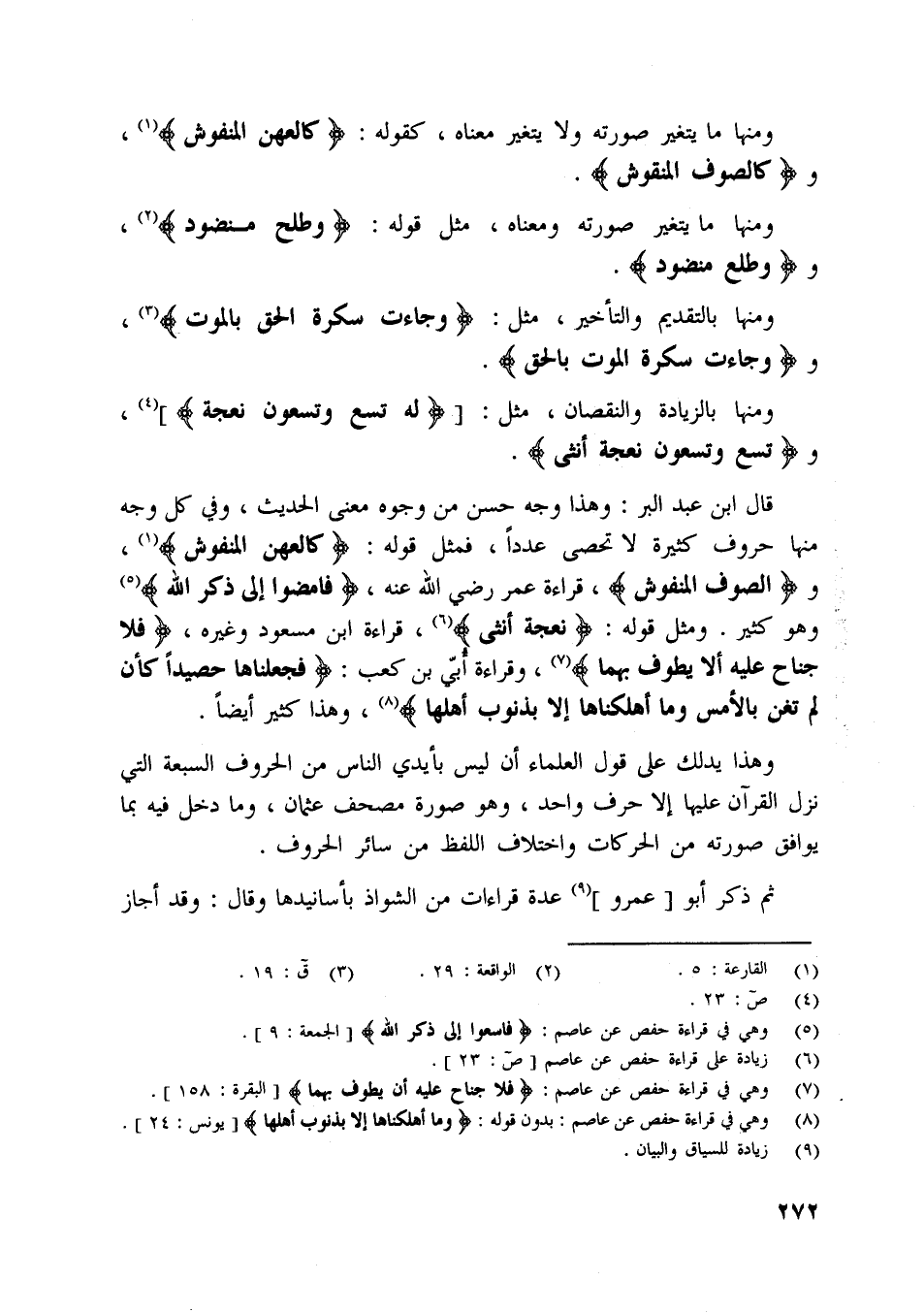 قال ابن عبد البر: وهذا وجه حسن من وجوه معنى الحديث، وفي كل وجه منها حروف كثيرة لا تحصى عددا، فمثل قوله: كَالْعِهْنِ الْمَنْفُوشِ [ (1) ] ، والصوف المنفوش، قراءة عمر رضي اللَّه عنه، فامضوا إلى ذكر اللَّه [ (5) ] وهو كثير. ومثل قوله: نعجة أنثى [ (6) ] ، قراءة ابن مسعود وغيره، فلا جناح عليه ألا يطوف بهما [ (7) ] ، وقراءة أبي بن كعب: فَجَعَلْناها حَصِيداً كَأَنْ لَمْ تَغْنَ بِالْأَمْسِ وما أهلكناها إلا بذنوب أهلها [ (8) ] ، وهذا كثير أيضا.