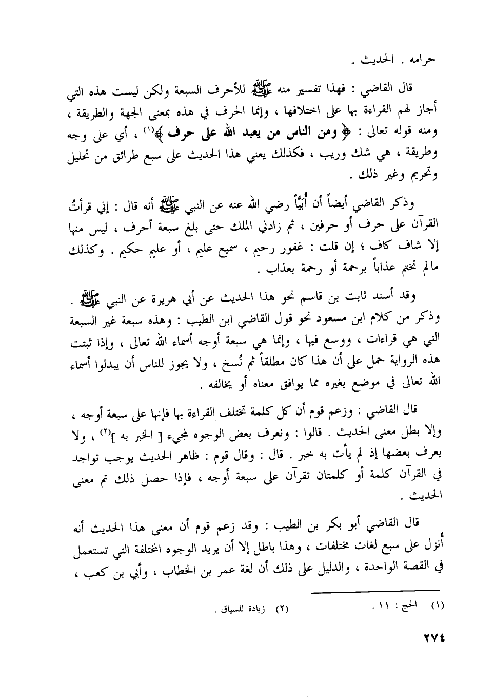 قال القاضي: وزعم قوم أن كل كلمة تختلف القراءة بها فإنّها على سبعة أوجه، وإلا بطل معنى الحديث. قالوا: ونعرف بعض الوجوه لمجيء [الخبر به] [ (2) ] ، ولا يعرف بعضها إذ لم يأت به خبر. قال: وقال قوم: ظاهر الحديث يوجب تواجد في القرآن كلمة أو كلمتان تقرءان على سبعة أوجه، فإذا حصل ذلك تم معنى الحديث.