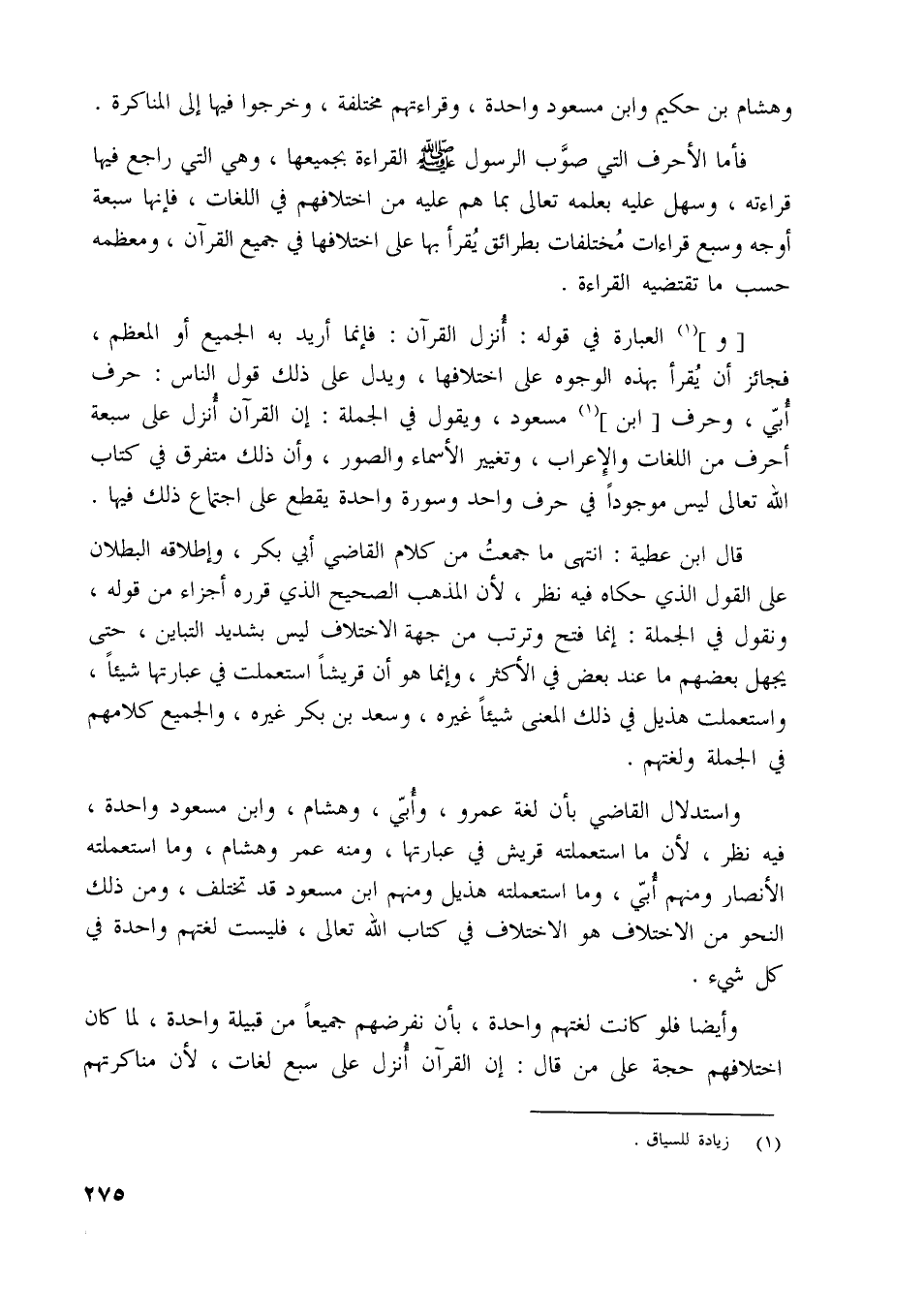 واستدلال القاضي بأن لغة عمرو، وأبي، وهشام، وابن مسعود واحدة، فيه نظر، لأن ما استعملته قريش في عبارتها، ومنه عمر وهشام، وما استعملته الأنصار ومنهم أبي، وما استعملته هذيل ومنهم ابن مسعود قد تختلف، ومن ذلك النحو من الاختلاف هو الاختلاف في كتاب اللَّه تعالى، فليست لغتهم واحدة في كل شيء.