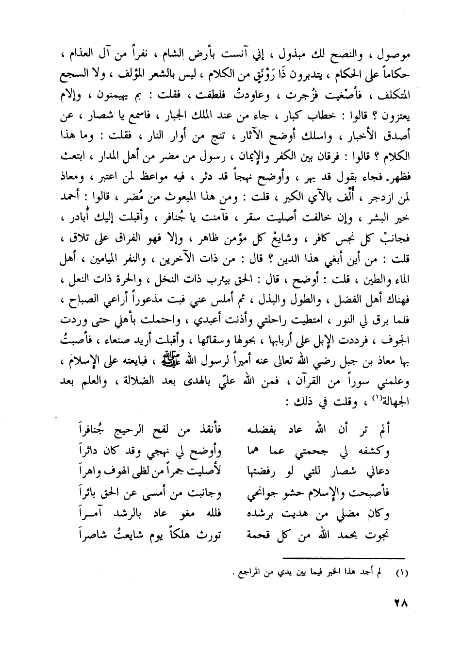 موصول، والنصح لك مبذول، إني آنست بأرض الشام، نفرا من آل العذام، حكاما على الحكام، يتدبرون ذا رونق من الكلام، ليس بالشعر المؤلف، ولا السجع المتكلف، فأصغيت فزجرت، وعاودت فلطفت، فقلت: بم يهيمنون، وإلام يعتزون؟ قالوا: خطاب كبار، جاء من عند الملك الجبار، فاسمع يا شصار، عن أصدق الأخبار، واسلك أوضح الآثار، تنج من أوار النار، فقلت: وما هذا الكلام؟ قالوا: فرقان بين الكفر والإيمان، رسول من مضر من أهل المدار، ابتعث فظهر. فجاء بقول قد بهر، وأوضح نهجا قد دثر، فيه مواعظ لمن اعتبر، ومعاذ لمن ازدجر، ألّف بالآي الكبر، قلت: ومن هذا المبعوث من مضر، قالوا: أحمد خير البشر، وإن خالفت أصليت سقر، فآمنت يا جنافر، وأقبلت إليك أبادر، فجانب كل نجس كافر، وشايع كل مؤمن ظاهر، وإلا فهو الفراق على تلاق، قلت: من أين أبغي هذا الدين؟ قال: من ذات الآخرين، والنفر الميامين، أهل الماء والطين، قلت: أوضح، قال: الحق بيثرب ذات النخل، والحرة ذات النعل، فهناك أهل الفضل، والطول والبذل، ثم أملس عني فبت مذعورا أراعي الصباح، فلما برق لي النور، امتطيت راحلتي وأذنت أعبدي، واحتملت بأهلي حتى وردت الجوف، فرددت الإبل على أربابها، بحولها وسقائها، وأقبلت أريد صنعاء، فأصبت بها معاذ بن جبل رضي اللَّه تعالى عنه أميرا لرسول اللَّه صلّى اللَّه عليه وسلم، فبايعته على الإسلام، وعلمني سورا من القرآن، فمن اللَّه عليّ بالهدى بعد الضلالة، والعلم بعد الجهالة [ (1) ] ، وقلت في ذلك: