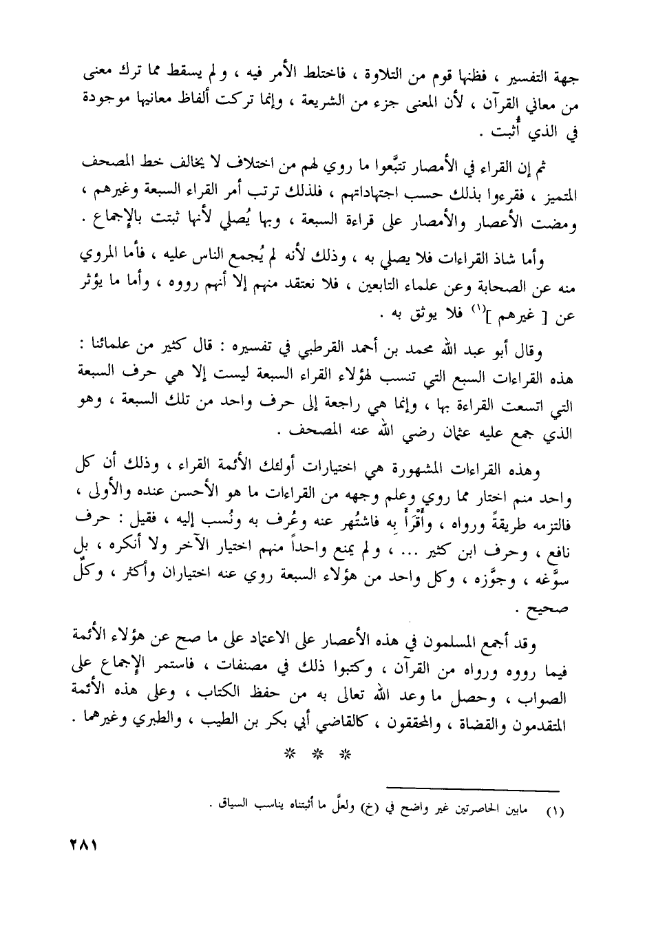 وقد أجمع المسلمون في هذه الأعصار على الاعتماد على ما صح عن هؤلاء الأئمة فيما رووه ورواه من القرآن، وكتبوا ذلك في مصنفات، فاستمر الإجماع على الصواب، وحصل ما وعد اللَّه تعالى به من حفظ الكتاب، وعلى هذه الأئمة المتقدمون والقضاة، والمحققون، كالقاضي أبي بكر بن الطيب، والطبري وغيرهما.