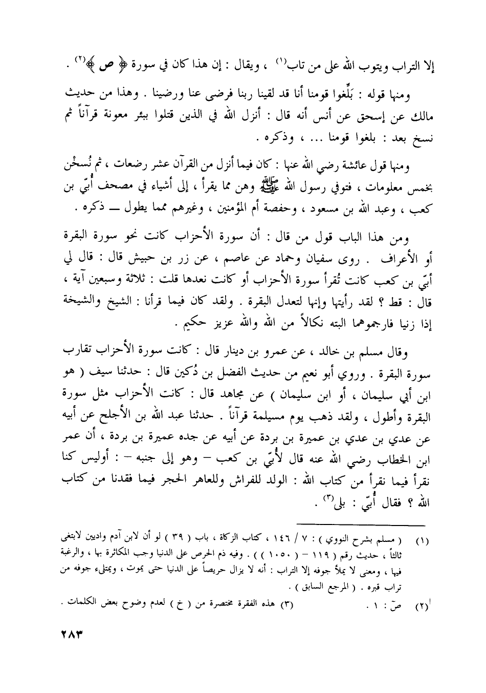 ومن هذا الباب قول من قال: أن سورة الأحزاب كانت نحو سورة البقرة أو الأعراف. روى سفيان وحماد عن عاصم، عن زر بن حبيش قال: قال لي أبي بن كعب كانت تقرأ سورة الأحزاب أو كانت نعدها قلت: ثلاثة وسبعين آية، قال: قط؟ لقد رأيتها وإنها لتعدل البقرة. ولقد كان فيما قرأنا: الشيخ والشيخة إذا زنيا فارجموهما البتة نكالا من اللَّه واللَّه عزيز حكيم.