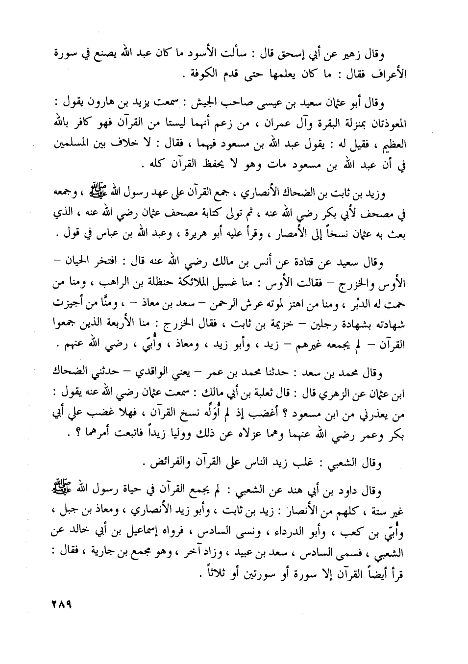 وقال داود بن أبي هند عن الشعبي: لم يجمع القرآن في حياة رسول اللَّه صلّى اللَّه عليه وسلم غير ستة، كلهم من الأنصار: زيد بن ثابت، وأبو زيد الأنصاري، ومعاذ بن جبل، وأبي بن كعب، وأبو الدرداء، ونسي السادس، فرواه إسماعيل بن أبي خالد عن الشعبي، فسمى السادس، سعد بن عبيد، وزاد آخر، وهو مجمع بن جارية، فقال: