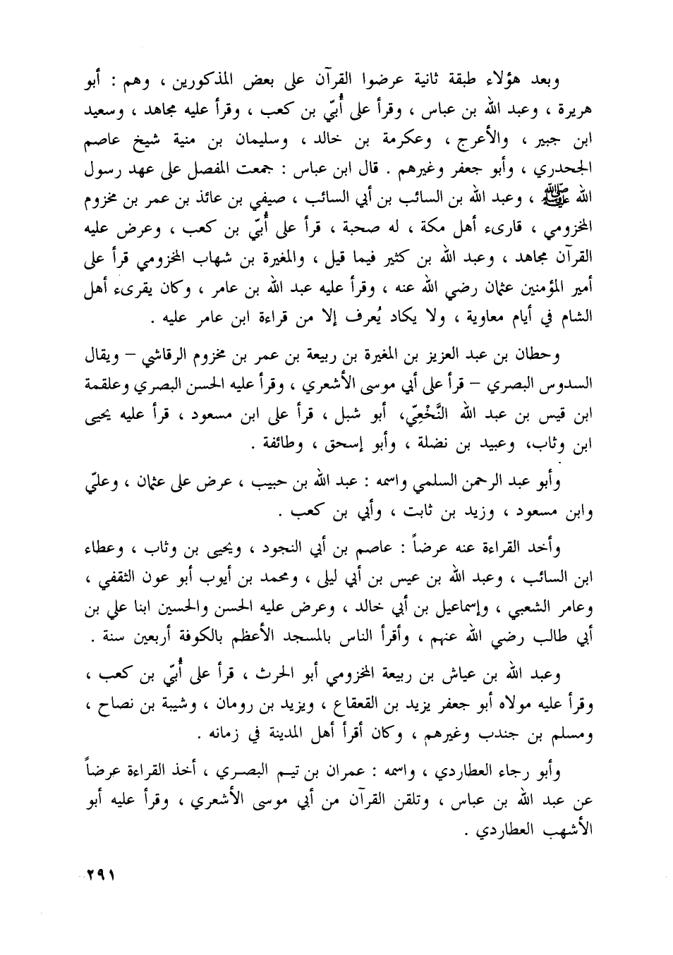 وبعد هؤلاء طبقة ثانية عرضوا القرآن على بعض المذكورين، وهم: أبو هريرة، وعبد اللَّه بن عباس، وقرأ على أبي بن كعب، وقرأ عليه مجاهد، وسعيد ابن جبير، والأعرج، وعكرمة بن خالد، وسليمان بن منية شيخ عاصم الجحدري، وأبو جعفر وغيرهم. قال ابن عباس: جمعت المفصل على عهد رسول اللَّه صلّى اللَّه عليه وسلم، وعبد اللَّه بن السائب بن أبي السائب، صيفي بن عائذ بن عمر بن مخزوم المخزومي، قارئ أهل مكة، له صحبة، قرأ على أبي بن كعب، وعرض عليه القرآن مجاهد، وعبد اللَّه بن كثير فيما قيل، والمغيرة بن شهاب المخزومي قرأ على أمير المؤمنين عثمان رضي اللَّه عنه، وقرأ عليه عبد اللَّه بن عامر، وكان يقرئ أهل الشام في أيام معاوية، ولا يكاد يعرف إلا من قراءة ابن عامر عليه.