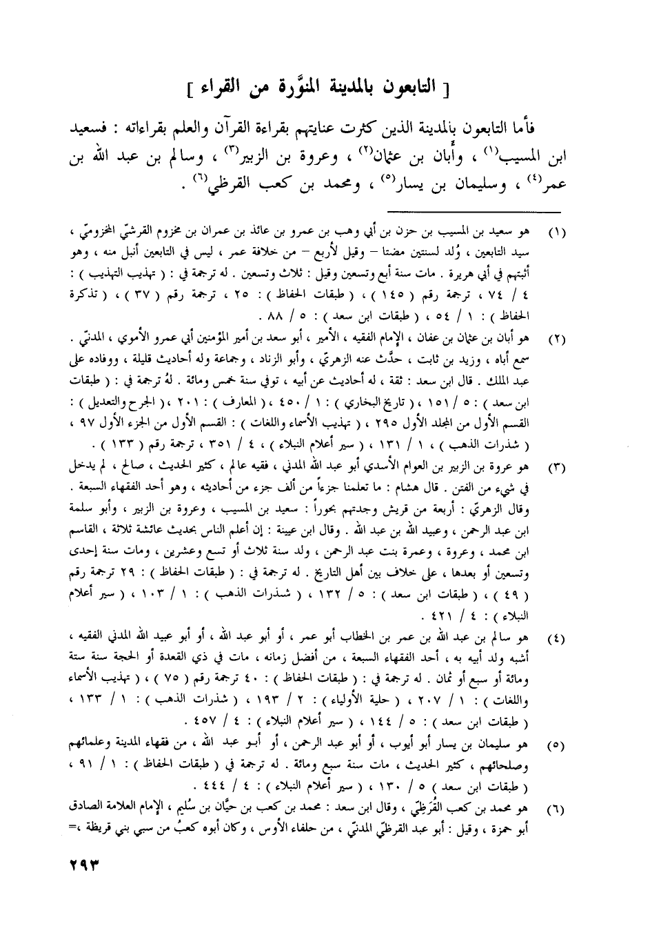 فأما التابعون بالمدينة الذين كثرت عنايتهم بقراءة القرآن والعلم بقراءاته: فسعيد ابن المسيب [ (1) ] ، وأبان بن عثمان [ (2) ] ، وعروة بن الزبير [ (3) ] ، وسالم بن عبد اللَّه بن عمر [ (4) ] ، وسليمان بن يسار [ (5) ] ، ومحمد بن كعب القرظي [ (6) ] .