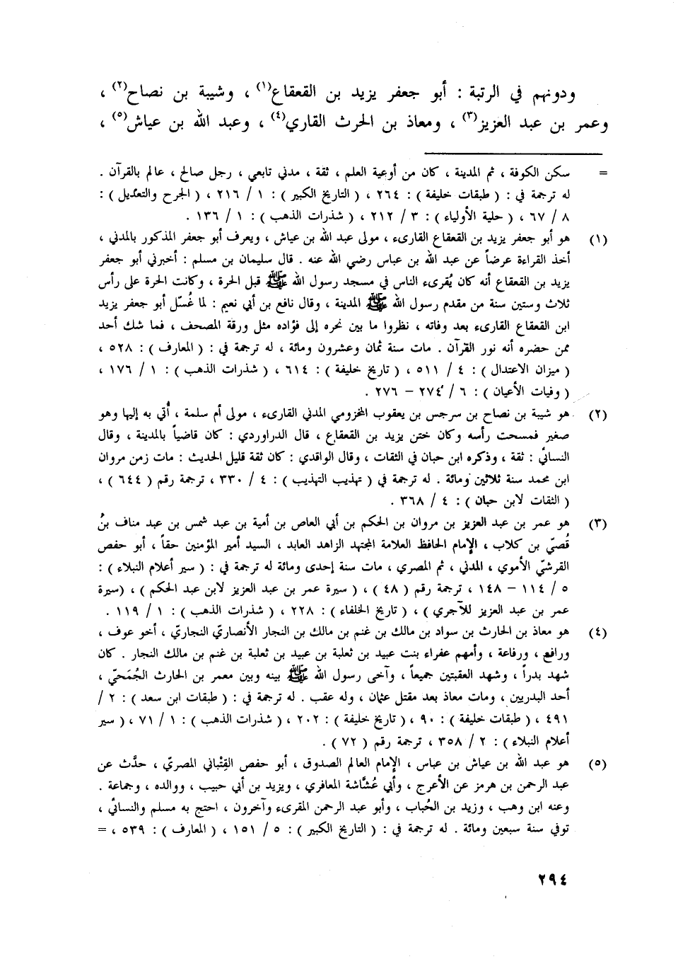 ودونهم في الرتبة: أبو جعفر يزيد بن القعقاع [ (1) ] ، وشيبة بن نصاح [ (2) ] ، وعمر بن عبد العزيز [ (3) ] ، ومعاذ بن الحرث القاري [ (4) ] ، وعبد اللَّه بن عياش [ (5) ] ،
