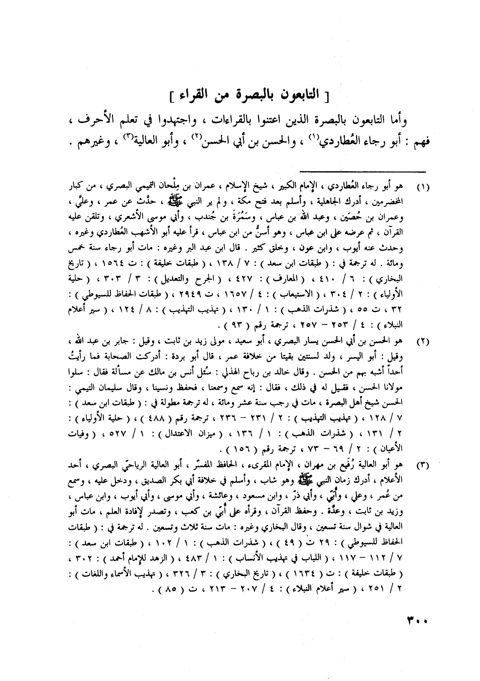 وأما التابعون بالبصرة الذين اعتنوا بالقراءات، واجتهدوا في تعلم الأحرف، فهم: أبو رجاء العطاردي [ (1) ] ، والحسن بن أبي الحسن [ (2) ] ، وأبو العالية [ (3) ] ، وغيرهم.