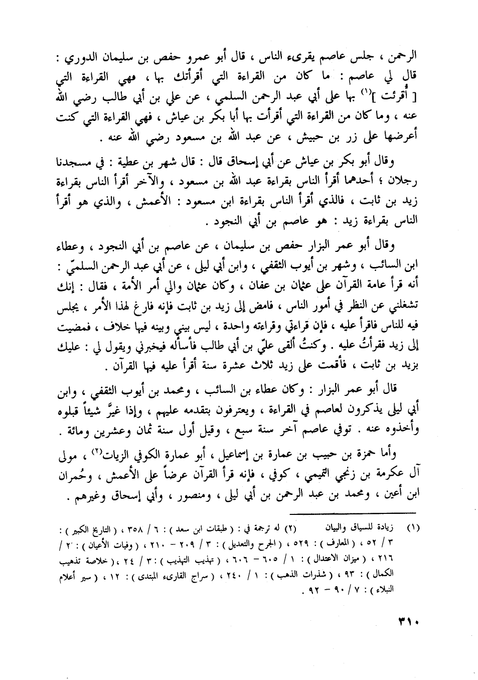 قال لي عاصم: ما كان من القراءة التي أقرأتك بها، فهي القراءة التي [أقرئت] [ (1) ] بها على أبي عبد الرحمن السلمي، عن علي بن أبي طالب رضي اللَّه عنه، وما كان من القراءة التي أقرأت بها أبا بكر بن عياش، فهي القراءة التي كنت أعرضها على زر بن حبيش، عن عبد اللَّه بن مسعود رضي اللَّه عنه.