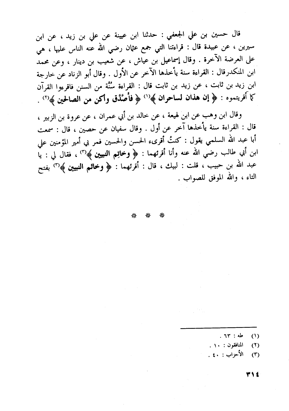 قال حسين بن علي الجعفي: حدثنا ابن عيينة عن علي بن زيد، عن ابن سيرين، عن عبيدة قال: قراءتنا التي جمع عثمان رضي اللَّه عنه الناس عليها، هي على العرضة الآخرة. وقال إسماعيل بن عياش، عن شعيب بن دينار، وعن محمد ابن المنكدر قال: القراءة سنة يأخذها الآخر عن الأول. وقال أبو الزناد عن خارجة ابن زيد بن ثابت، عن زيد بن ثابت قال: القراءة سنّة من السنن فاقرءوا القرآن كما أقرأتموه: إِنْ هذانِ لَساحِرانِ [ (1) ] فَأَصَّدَّقَ وَأَكُنْ مِنَ الصَّالِحِينَ [ (2) ] .
