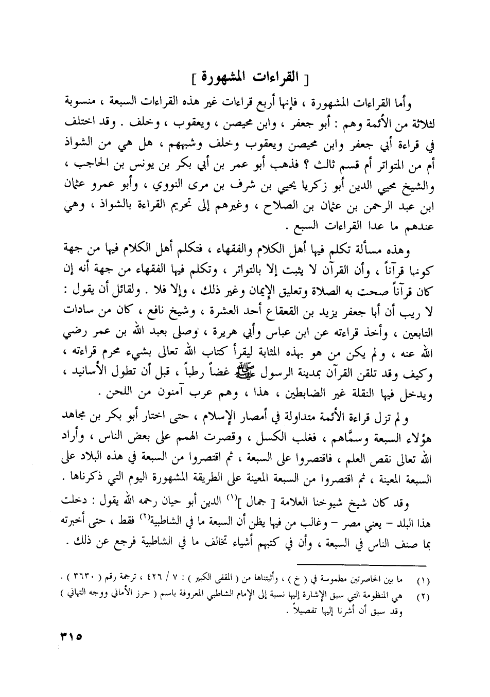 [ (2) ] هي المنظومة التي سبق الإشارة إليها نسبة إلى الإمام الشاطبي المعروفة باسم (حرز الأماني ووجه التهاني) وقد سبق أن أشرنا إليها تفصيلا.