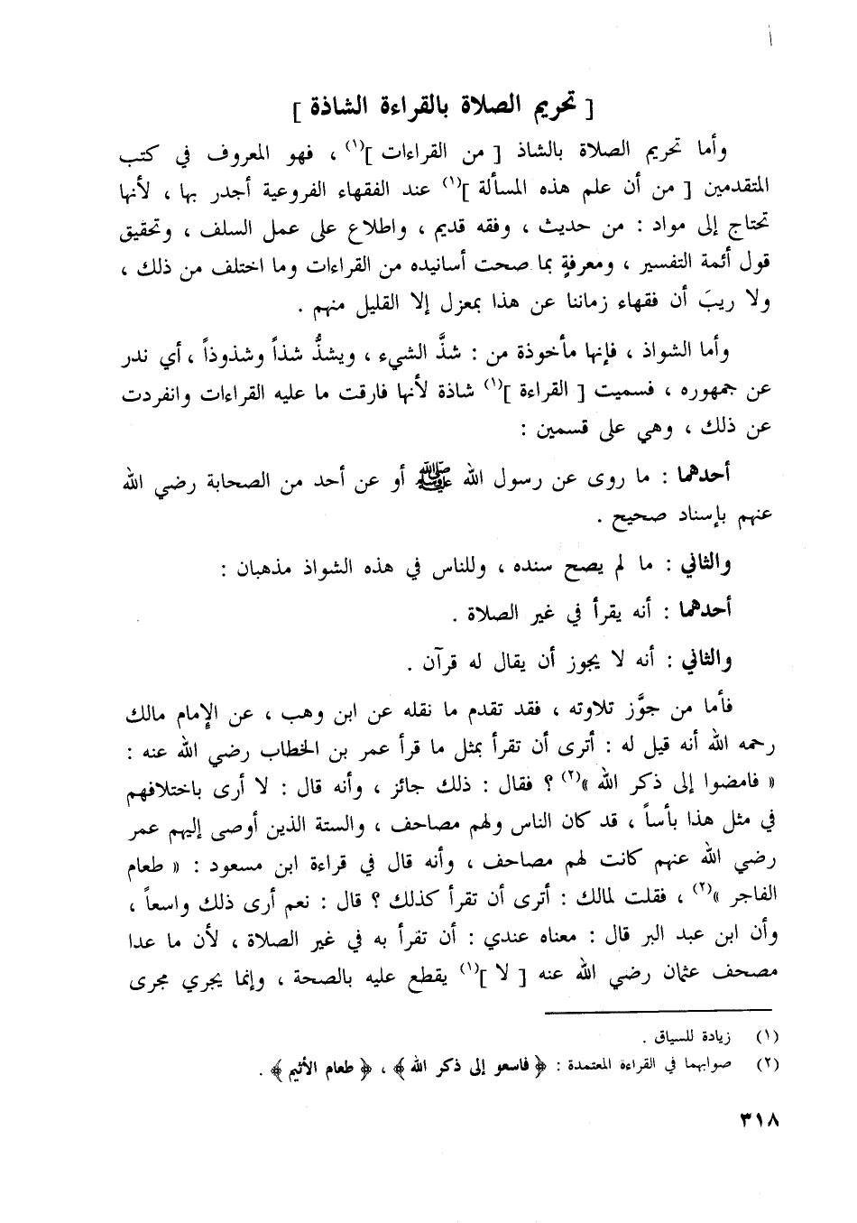 وأما تحريم الصلاة بالشاذ [من القراءات] [ (1) ] ، فهو المعروف في كتب المتقدمين [من أن علم هذه المسألة] [ (1) ] عند الفقهاء الفروعية أجدر بها، لأنها تحتاج إلى مواد: من حديث، وفقه قديم، واطلاع على عمل السلف، وتحقيق قول أئمة التفسير، ومعرفة بما صحت أسانيده من القراءات وما اختلف من ذلك، ولا ريب أن فقهاء زماننا عن هذا بمعزل إلا القليل منهم.