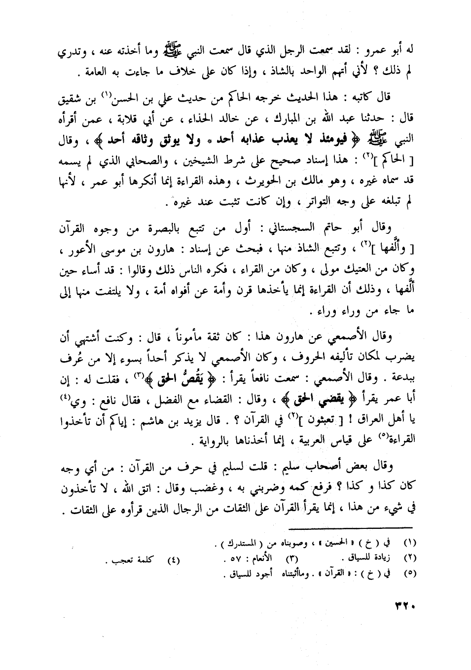 وقال الأصمعي عن هارون هذا: كان ثقة مأمونا، قال: وكنت أشتهي أن يضرب لمكان تأليفه الحروف، وكان الأصمعي لا يذكر أحدا بسوء إلا من عرف ببدعة. وقال الأصمعي: سمعت نافعا يقرأ: يَقُصُّ الْحَقَّ [ (3) ] ، فقلت له: إن أبا عمر يقرأ يقضي الحق، وقال: القضاء مع الفضل، فقال نافع: وي [ (4) ] يا أهل العراق! [تعبثون] [ (2) ] في القرآن؟. قال يزيد بن هاشم: إياكم أن تأخذوا القراءة [ (5) ] على قياس العربية، إنما أخذناها بالرواية.