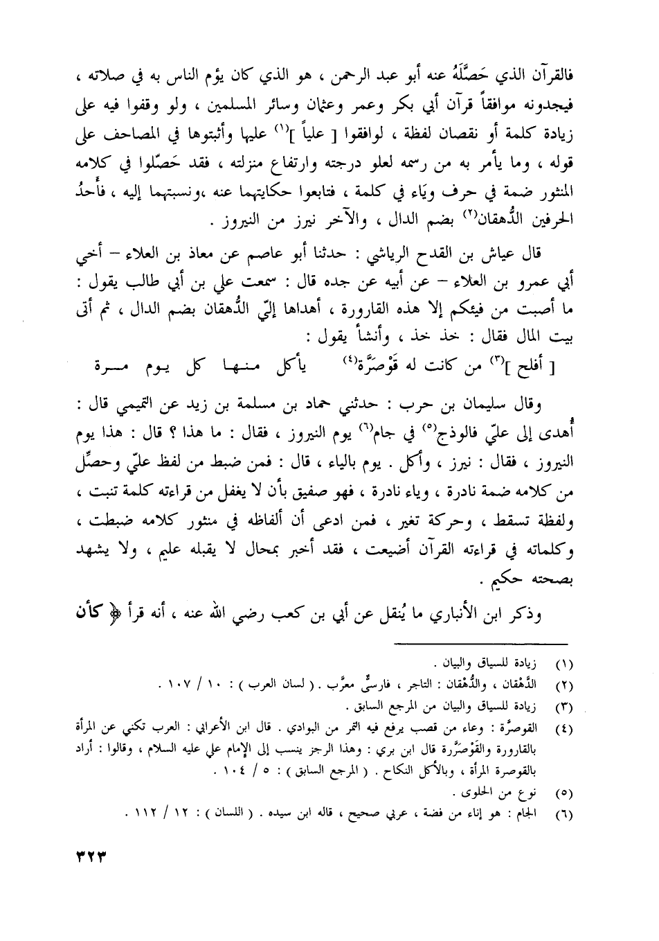فالقرآن الّذي حصّله عنه أبو عبد الرحمن، هو الّذي كان يؤم الناس به في صلاته، فيجدونه موافقا قرآن أبي بكر وعمر وعثمان وسائر المسلمين، ولو وقفوا فيه على زيادة كلمة أو نقصان لفظة، لوافقوا [عليا] [ (1) ] عليها وأثبتوها في المصاحف على قوله، وما يأمر به من رسمه لعلو درجته وارتفاع منزلته، فقد حصّلوا في كلامه المنثور ضمة في حرف وياء في كلمة، فتابعوا حكايتهما عنه، ونسبتهما إليه، فأحد الحرفين الدّهقان [ (2) ] بضم الدال، والآخر نيرز من النيروز.