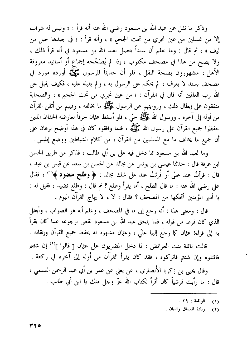 وذكر ما نقل عن عبد اللَّه بن مسعود رضي اللَّه عنه أنه قرأ: «وليس له شراب إلا من غسلين من عين تجري من تحت الجحيم» ، وأنه قرأ: «في جيدها حبل من ليف» ، ثم قال: وما نعلم أن سندا يتصل بعبد اللَّه بن مسعود في أنه قرأ ذلك، ولا يصح من هذا في مصحف مكتوب، إذا لم يصحّحه إجماع أو أسانيد معروفة الأهل، مشهورون بصحة النقل، فلو أن حديثا للرسول صلّى اللَّه عليه وسلم أورده مورد في مصحف بسند لا يعرف، لم يحكم على الرسول به، ولم يقبله عليه، فكيف يقبل على اللَّه رب العالمين أنه قال في القرآن: «من عين تجري من تحت الجحيم» ، والصحابة متفقون على إبطال ذلك، وروايتهم عن الرسول صلّى اللَّه عليه وسلم ما يخالفه، وفيهم من أتقن القرآن من أوله إلى آخره، ورسول اللَّه صلّى اللَّه عليه وسلم حيّ، فلو أسقط عثمان حرفا لعارضه الحفاظ الذين حفظوا جميع القرآن على رسول اللَّه صلّى اللَّه عليه وسلم، فلما وافقوه كان في هذا أوضح برهان على أن جميع ما يخالف ما مع المسلمين من القرآن، من كلام الشياطين ووضع إبليس.