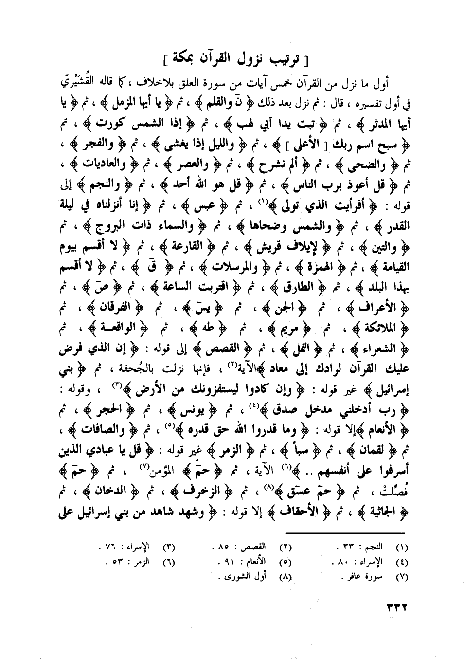 أول ما نزل من القرآن خمس آيات من سورة العلق بلا خلاف، كما قاله القشيريّ في أول تفسيره، قال: ثم نزل بعد ذلك ن وَالْقَلَمِ، ثم يا أَيُّهَا الْمُزَّمِّلُ، ثم يا أَيُّهَا الْمُدَّثِّرُ، ثم تَبَّتْ يَدا أَبِي لَهَبٍ، ثم إِذَا الشَّمْسُ كُوِّرَتْ، ثم سَبِّحِ اسْمَ رَبِّكَ [الْأَعْلَى] ، ثم وَاللَّيْلِ إِذا يَغْشى، ثم وَالْفَجْرِ، ثم وَالضُّحى، ثم أَلَمْ نَشْرَحْ، ثم وَالْعَصْرِ، ثم وَالْعادِياتِ، ثم قُلْ أَعُوذُ بِرَبِّ النَّاسِ، ثم قُلْ هُوَ اللَّهُ أَحَدٌ، ثم وَالنَّجْمِ إلى قوله: أَفَرَأَيْتَ الَّذِي تَوَلَّى [ (1) ] ، ثم عَبَسَ، ثم إِنَّا أَنْزَلْناهُ فِي لَيْلَةِ الْقَدْرِ، ثم وَالشَّمْسِ وَضُحاها، ثم وَالسَّماءِ ذاتِ الْبُرُوجِ، ثم وَالتِّينِ، ثم لِإِيلافِ قُرَيْشٍ، ثم الْقارِعَةُ، ثم لا أُقْسِمُ بِيَوْمِ الْقِيامَةِ، ثم الهمزة، ثم وَالْمُرْسَلاتِ، ثم ق، ثم لا أُقْسِمُ بِهذَا الْبَلَدِ، ثم الطارق، ثم اقْتَرَبَتِ السَّاعَةُ، ثم ص، ثم الأعراف، ثم الجن، ثم يس، ثم الفرقان، ثم الملائكة، ثم مريم، ثم طه، ثم الْواقِعَةُ، ثم الشعراء، ثم النمل، ثم القصص إلى قوله: إِنَّ الَّذِي فَرَضَ عَلَيْكَ الْقُرْآنَ لَرادُّكَ إِلى مَعادٍ الآية [ (2) ] ، فإنّها نزلت بالجحفة، ثم بني إسرائيل غير قوله: وَإِنْ كادُوا لَيَسْتَفِزُّونَكَ مِنَ الْأَرْضِ [ (3) ] ، وقوله: