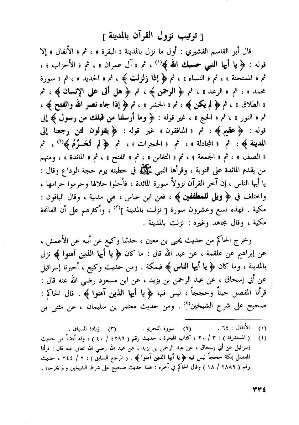 [ (4) ] (المستدرك) : 3/ 20، كتاب الهجرة، حديث رقم (4296/ 40) ، وله أيضا من حديث إسرائيل عن أبي إسحاق، عن عبد الرحمن بن يزيد، عن عبد اللَّه رضي اللَّه تعالى عنه قال: قرأنا المفصل بمكة حججا ليس فيه يا أَيُّهَا الَّذِينَ آمَنُوا. (المرجع السابق) : 2/ 244، حديث رقم (2889/ 18) وقال الحاكم في آخره: هذا حديث صحيح على شرط الشيخين ولم يخرجاه.