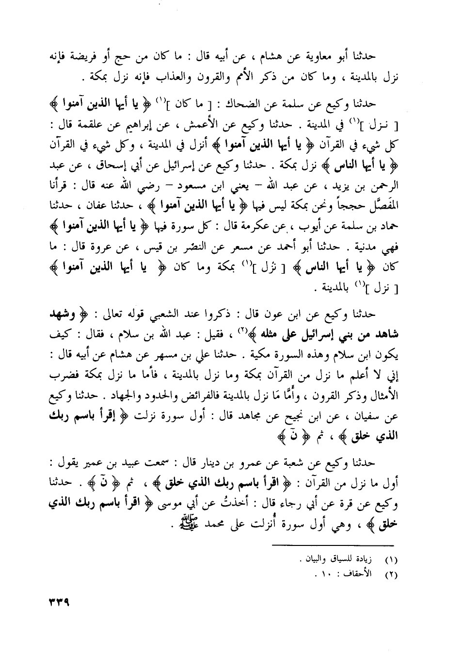 أول ما نزل من القرآن: اقْرَأْ بِاسْمِ رَبِّكَ الَّذِي خَلَقَ، ثم ن. حدثنا وكيع عن قرة عن أبي رجاء قال: أخذت عن أبي موسى اقْرَأْ بِاسْمِ رَبِّكَ الَّذِي خَلَقَ، وهي أول سورة أنزلت على محمد صلّى اللَّه عليه وسلم.
