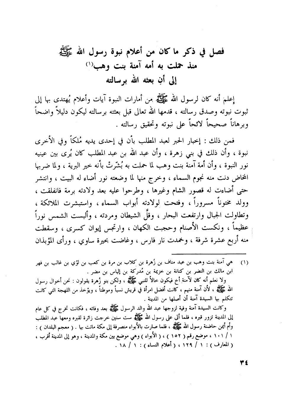 فصل في ذكر ما كان من أعلام نبوة رسول اللَّه صلّى اللَّه عليه وسلم منذ حملت به أمه آمنة بنت وهب [ (1) ] إلى أن بعثه اللَّه برسالته