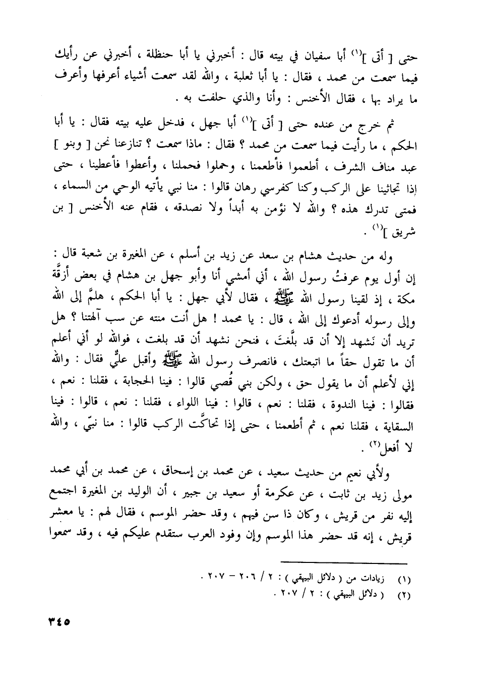 حتى [أتى] [ (1) ] أبا سفيان في بيته قال: أخبرني يا أبا حنظلة، أخبرني عن رأيك فيما سمعت من محمد، فقال: يا أبا ثعلبة، واللَّه لقد سمعت أشياء أعرفها وأعرف ما يراد بها، فقال الأخنس: وأنا والّذي حلفت به.